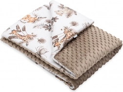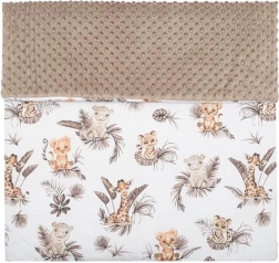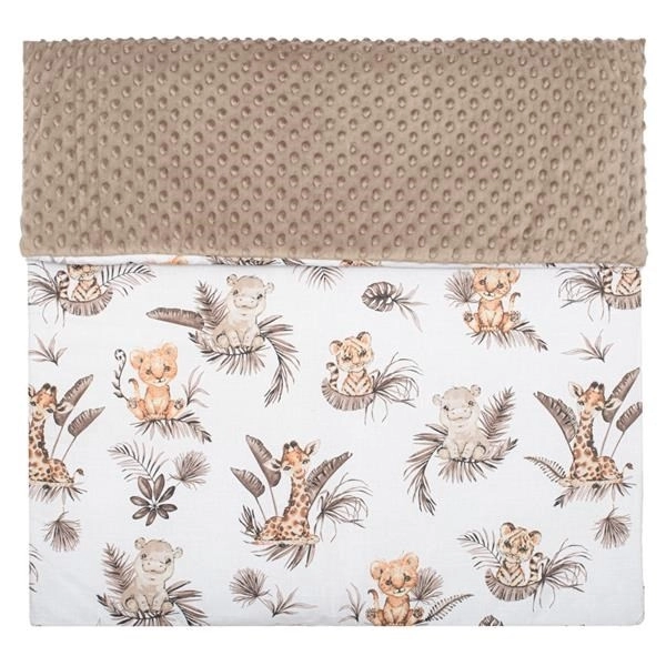 Pătură pentru copii moale și călduroasă, cu motiv Safari, combină țesătura catifelată minky și 100% bumbac de calitate, cu modele educative. Datorită umpluturii antialergice izolează excelent căldura, este potrivită de la naștere și ideală pentru pătuț, cărucior și scaun auto. Materialul nu lasă culori și nu irită pielea sensibilă.