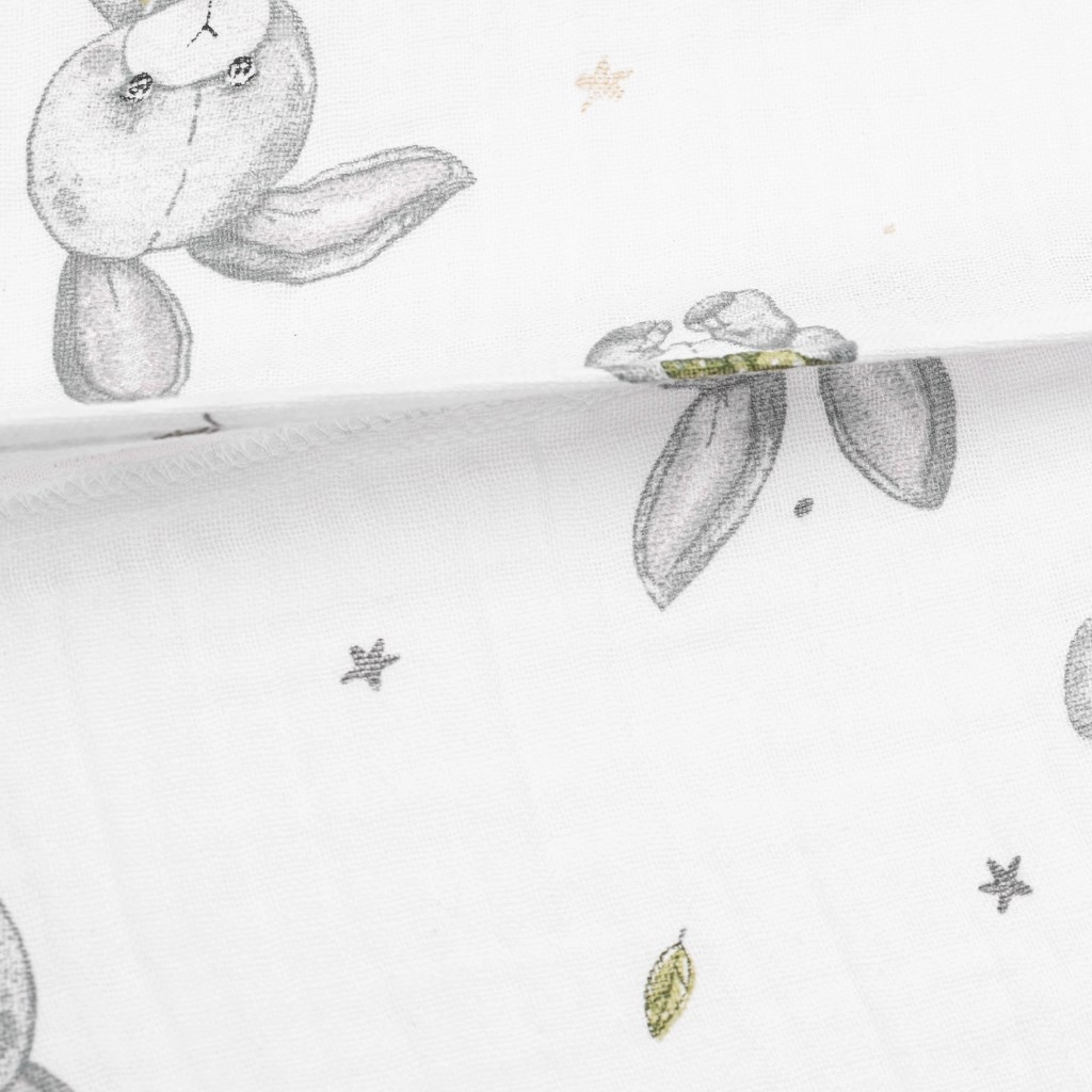 Husa NEW BABY, stilată și funcțională, din muselină de bumbac fină, asigură un somn liniștit și confortabil. Materialul este excepțional de moale, aerisit și plăcut la atingere, ideal chiar și pentru cei mai mici copii. Designul modern cu simpaticul motiv Bunny se potrivește perfect în orice cameră de copil.