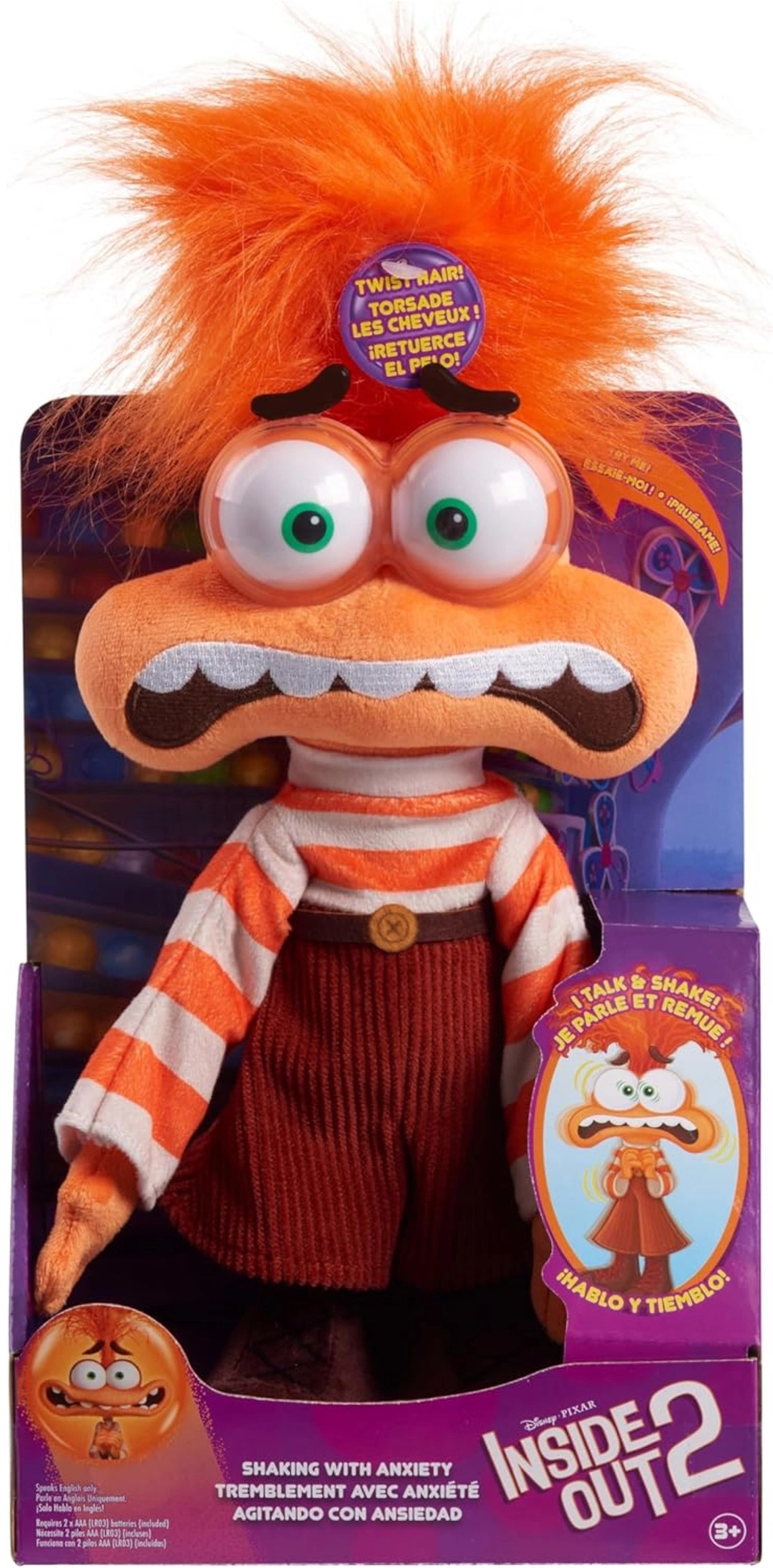 Plușul interactiv Teamă (Anxiety) se remarcă prin nuanțe de portocaliu, ochi expresivi și păr ciufulit. Are aproximativ 32 cm înălțime, este plăcut de moale și ideal pentru joaca de zi cu zi și pentru adormit. Prin rotirea capului se activează efectul de zguduire și se aud replici îndrăgite din film în limba engleză – o combinație excelentă de distracție și stimul pentru dezvoltarea imaginației.