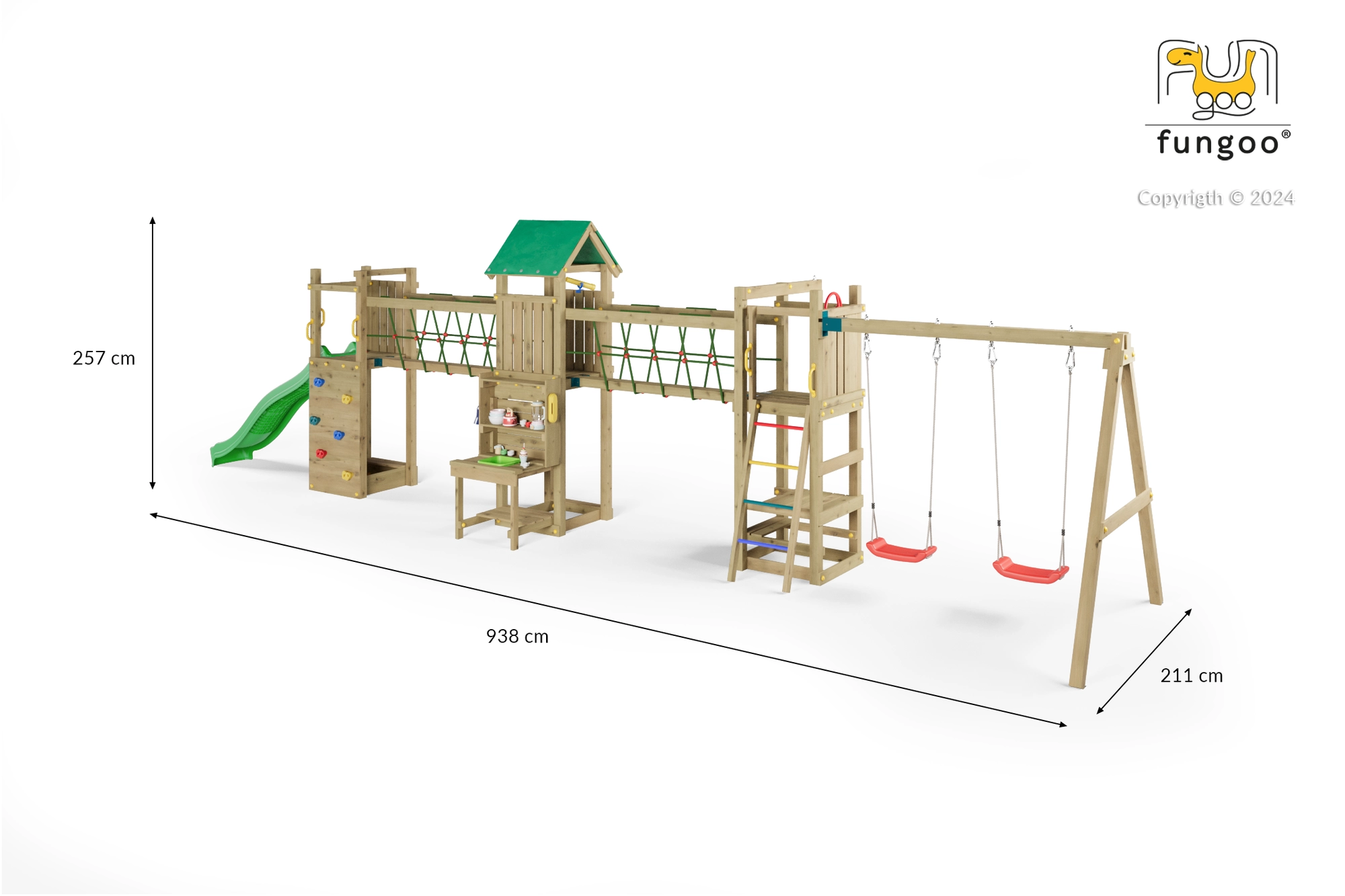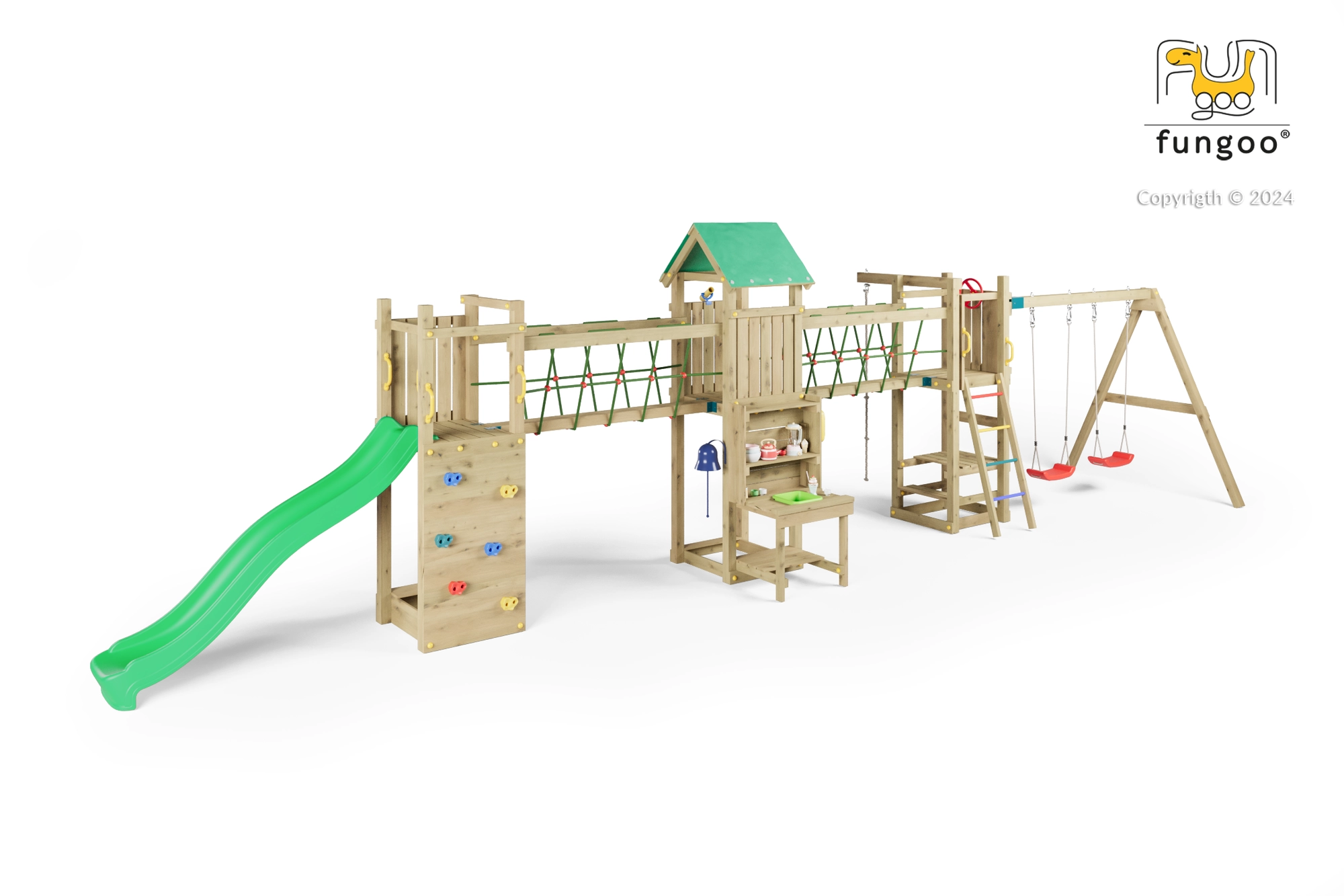 Locul de joacă din lemn Fungoo Space Longer transformă grădina ta într-un spațiu sigur și creativ, plin de mișcare. Oferă un tobogan lung de 220 cm, perete de cățărat cu frânghie, leagăne, pod cu frânghii și modul de bucătărie pentru jocuri de rol. Construcția impregnată sub presiune, rezistentă, este pregătită pentru utilizare zilnică, iar detaliile bine gândite susțin motricitatea, echilibrul și imaginația copiilor.
