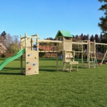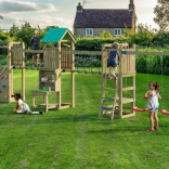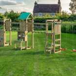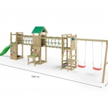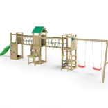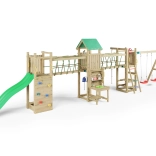 Locul de joacă este conceput pentru ore îndelungate de distracție activă în aer liber. Turnul din lemn cu acoperiș oferă umbră și adăpost, podul cu frânghii antrenează coordonarea, iar peretele de cățărat cu prize și frânghie dezvoltă forța și agilitatea. Toboganul de 2,2 m garantează coborâri iuți, iar cele două leagăne încântă copiii de toate vârstele.