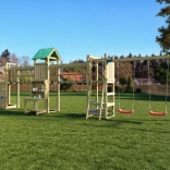 Două leagăne pentru bucuria mișcării și un modul de bucătărie cu „chiuvetă” pentru gătit creativ în nisip sau noroi – combinația ideală pentru mai mulți copii.