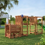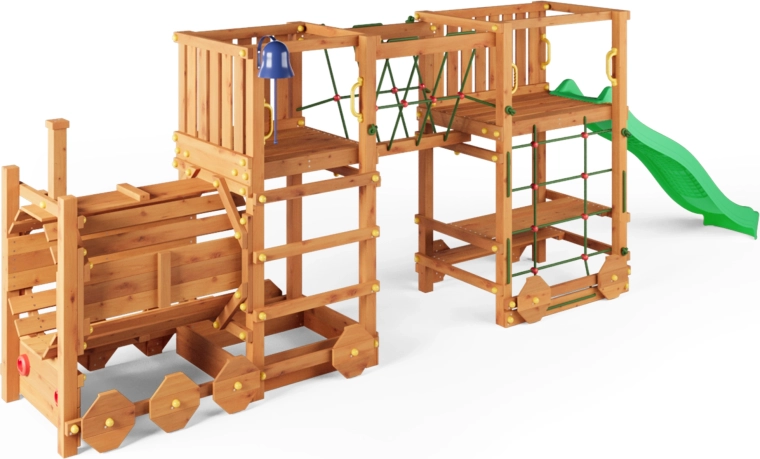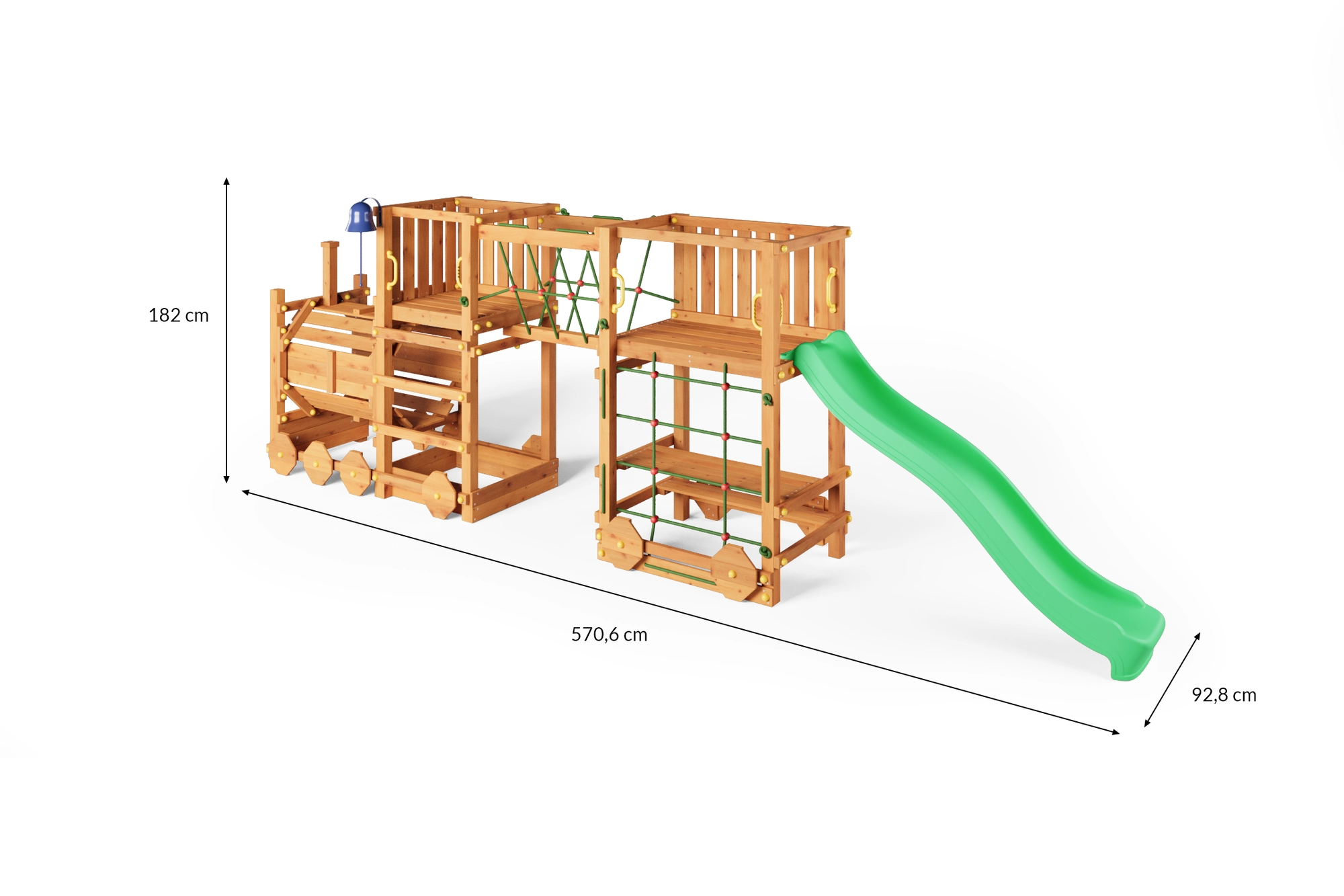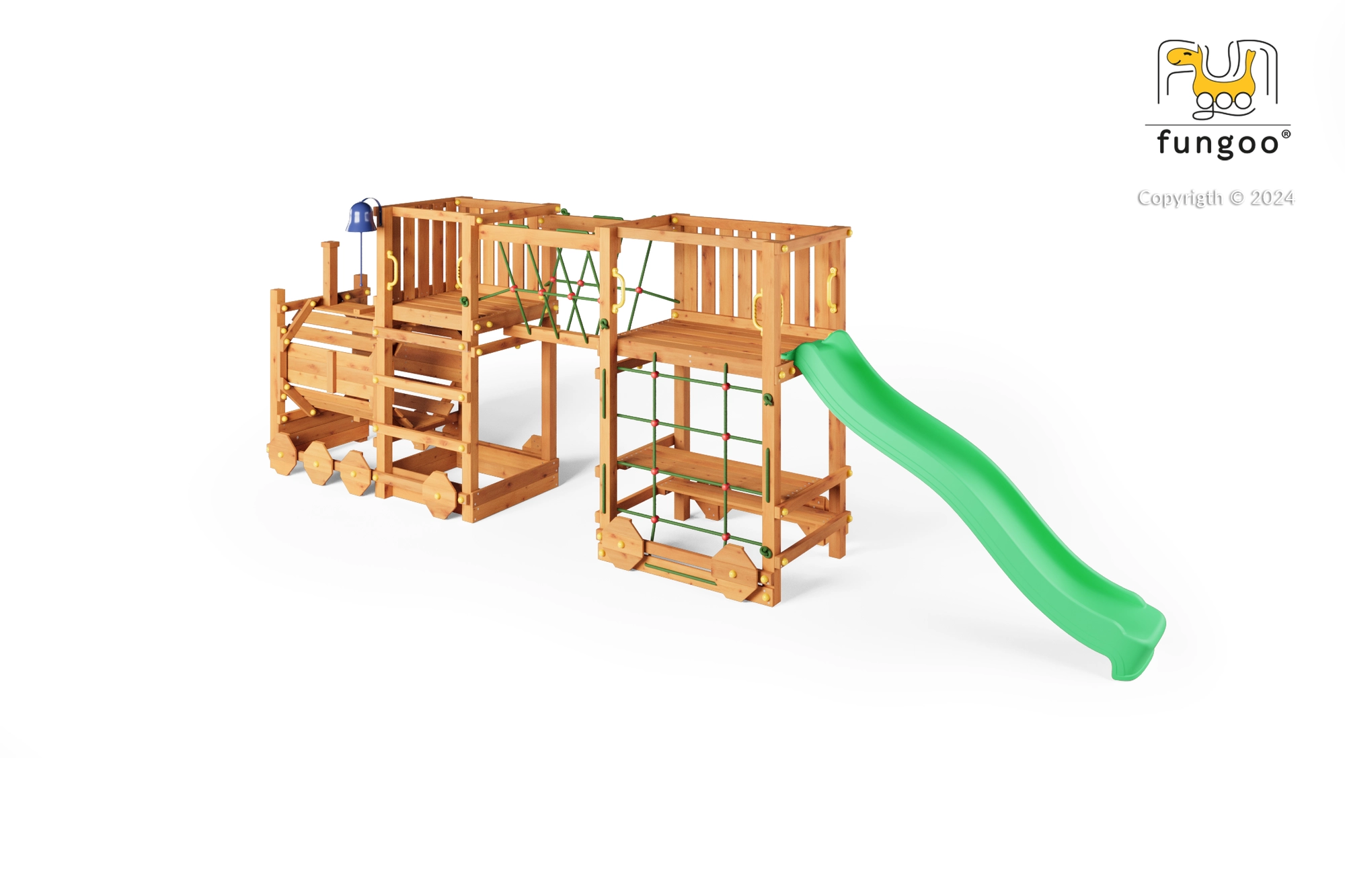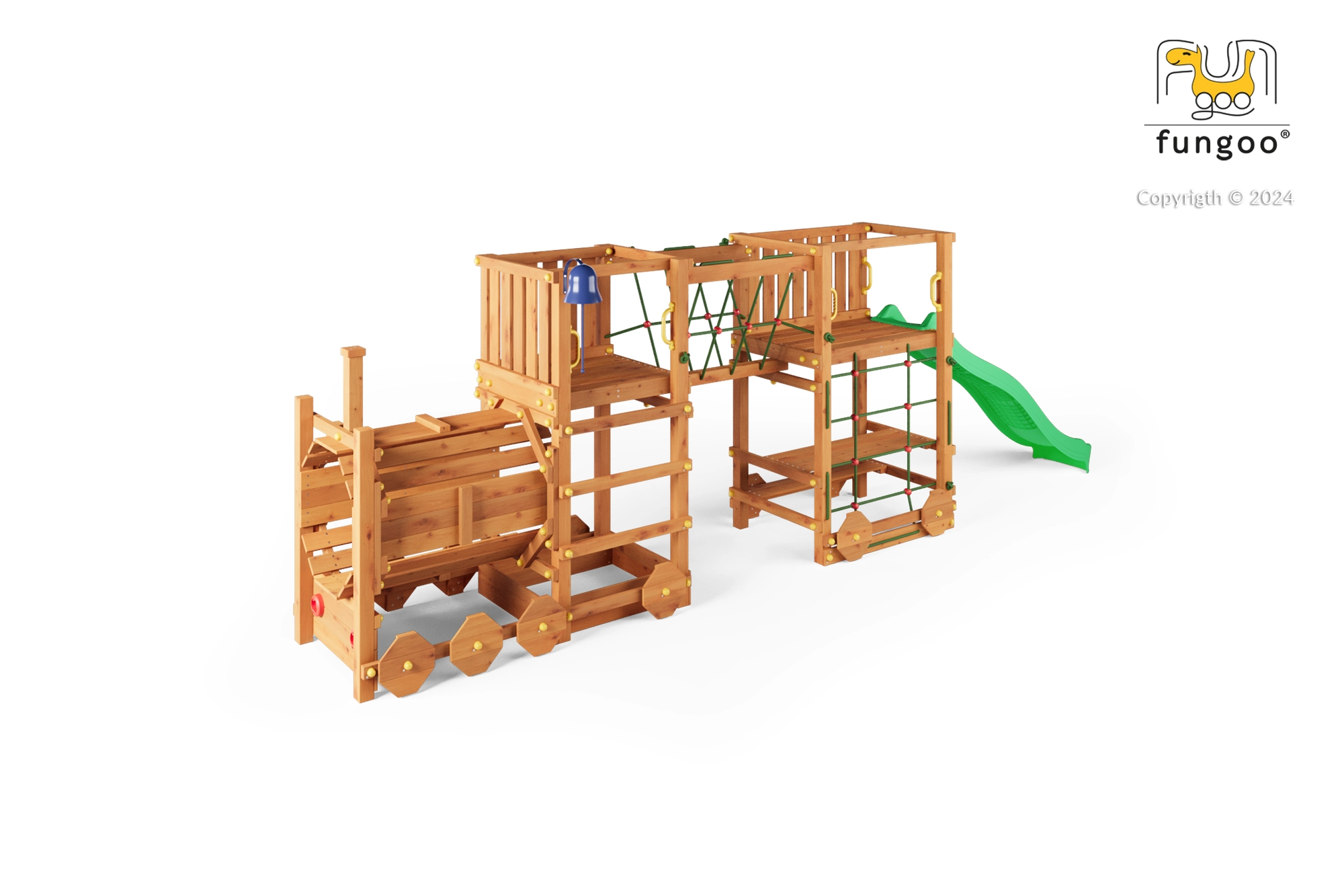 Locul de joacă FUNGOO Loco Express îmbină o construcție sigură din lemn cu o tematică captivantă de tren, care stimulează imaginația. Copiii pot să se cațere, să alunece, să treacă prin tunelul locomotivei și să se odihnească la măsuța de picnic de sub platformă. Datorită lemnului de calitate cu impregnare, ansamblul este stabil, durabil și ideal pentru joacă în aer liber pe tot parcursul zilei.