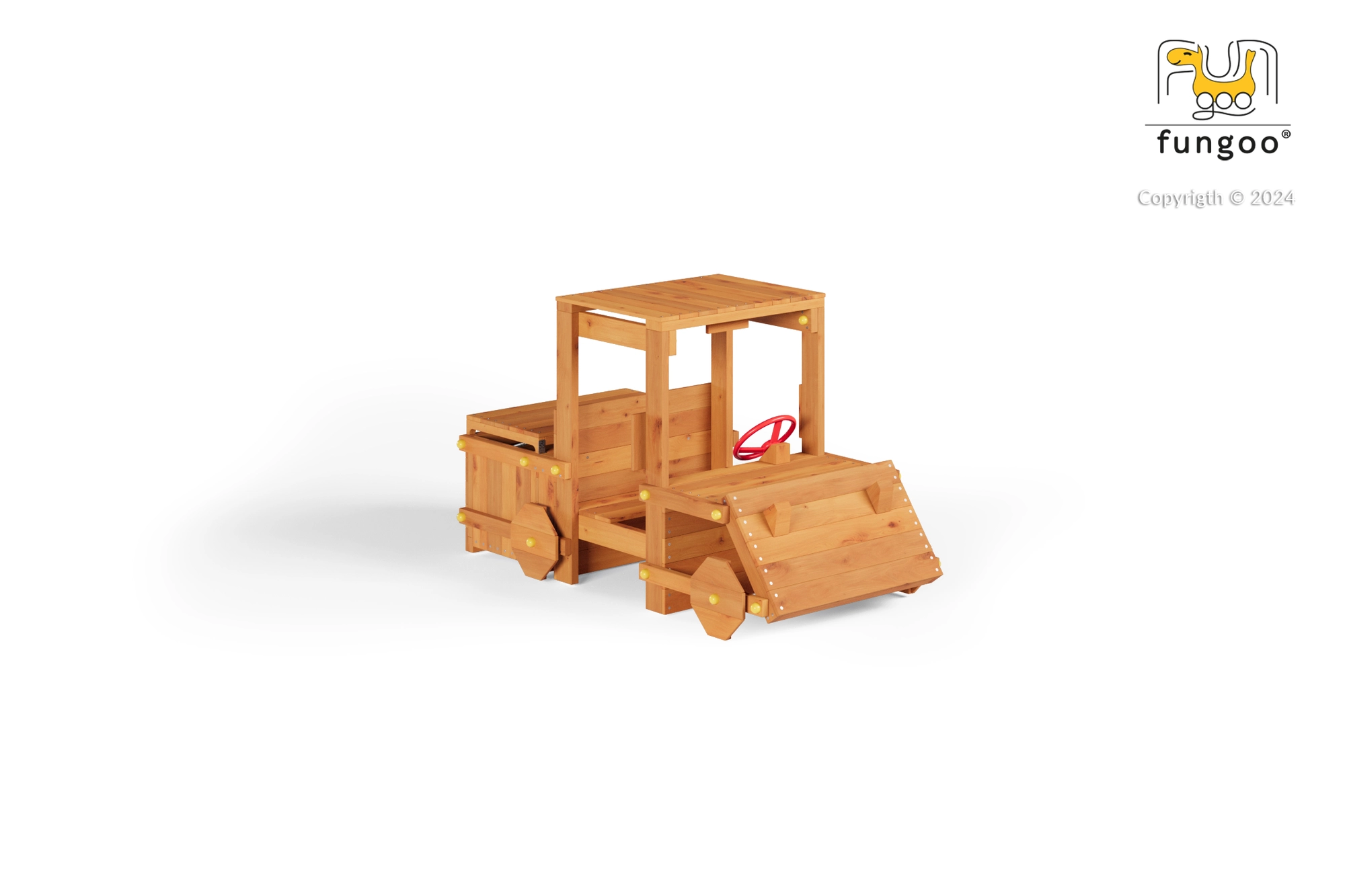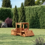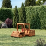 Construcția este realizată din lemn de calitate, tratat prin impregnare în nuanță de tec, pentru rezistență sporită la umiditate și UV. Pachetul include ancore de sol și elemente de siguranță pentru stabilitate și încredere chiar și la joacă mai intensă. Modelul este conceput pentru 2 mici șoferi simultan și oferă un spațiu practic de depozitare pentru mărunțișuri sau jucării.