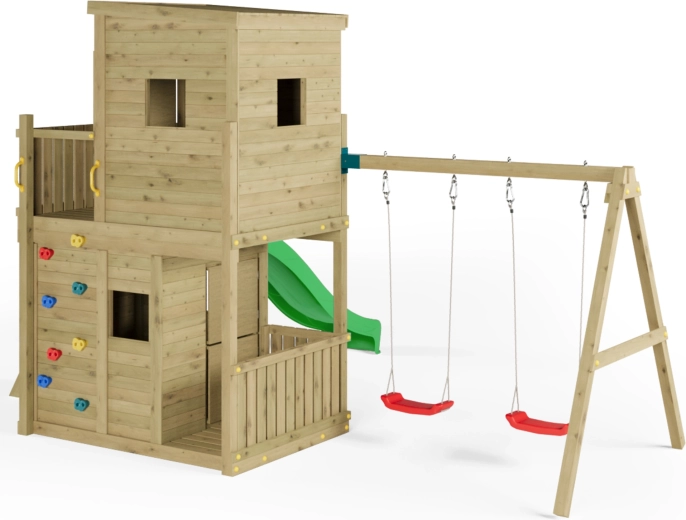 Prizele colorate pentru cățărare dezvoltă forța și coordonarea, iar cele două leagăne reglabile pe frânghii rezistente permit distracție individuală sau împreună.