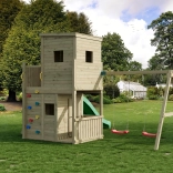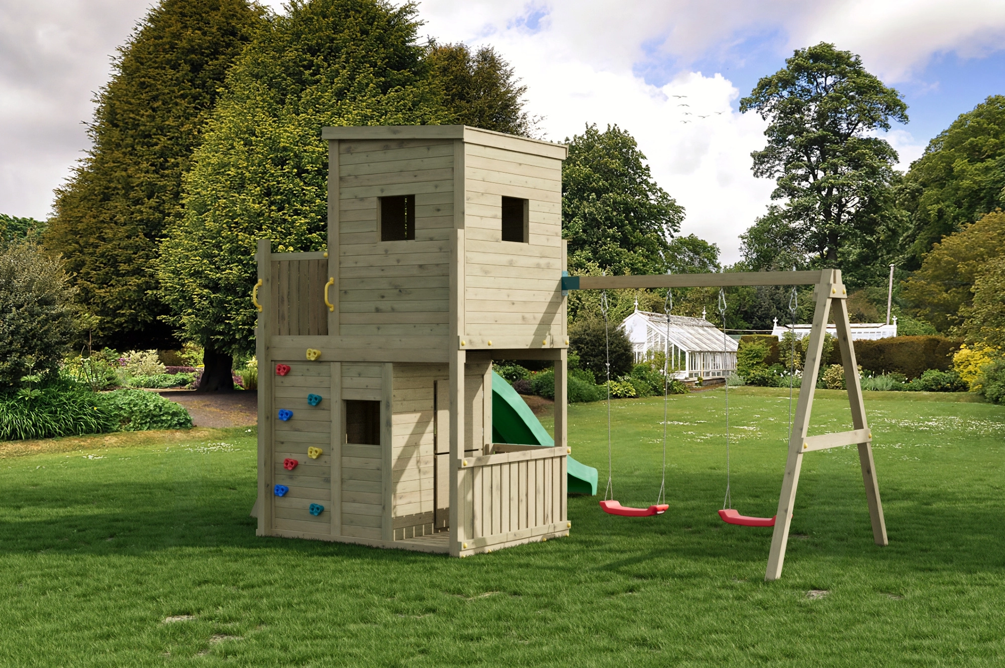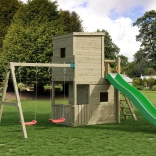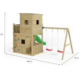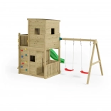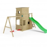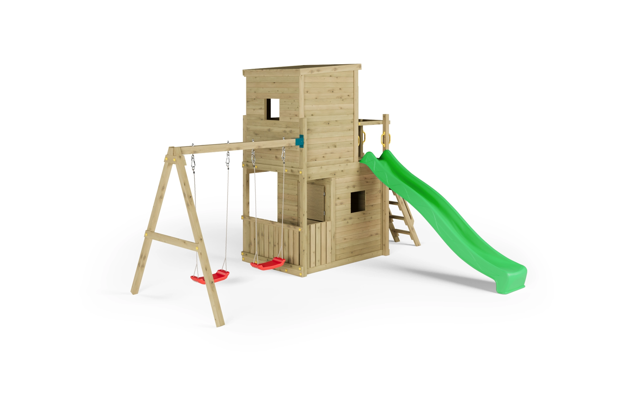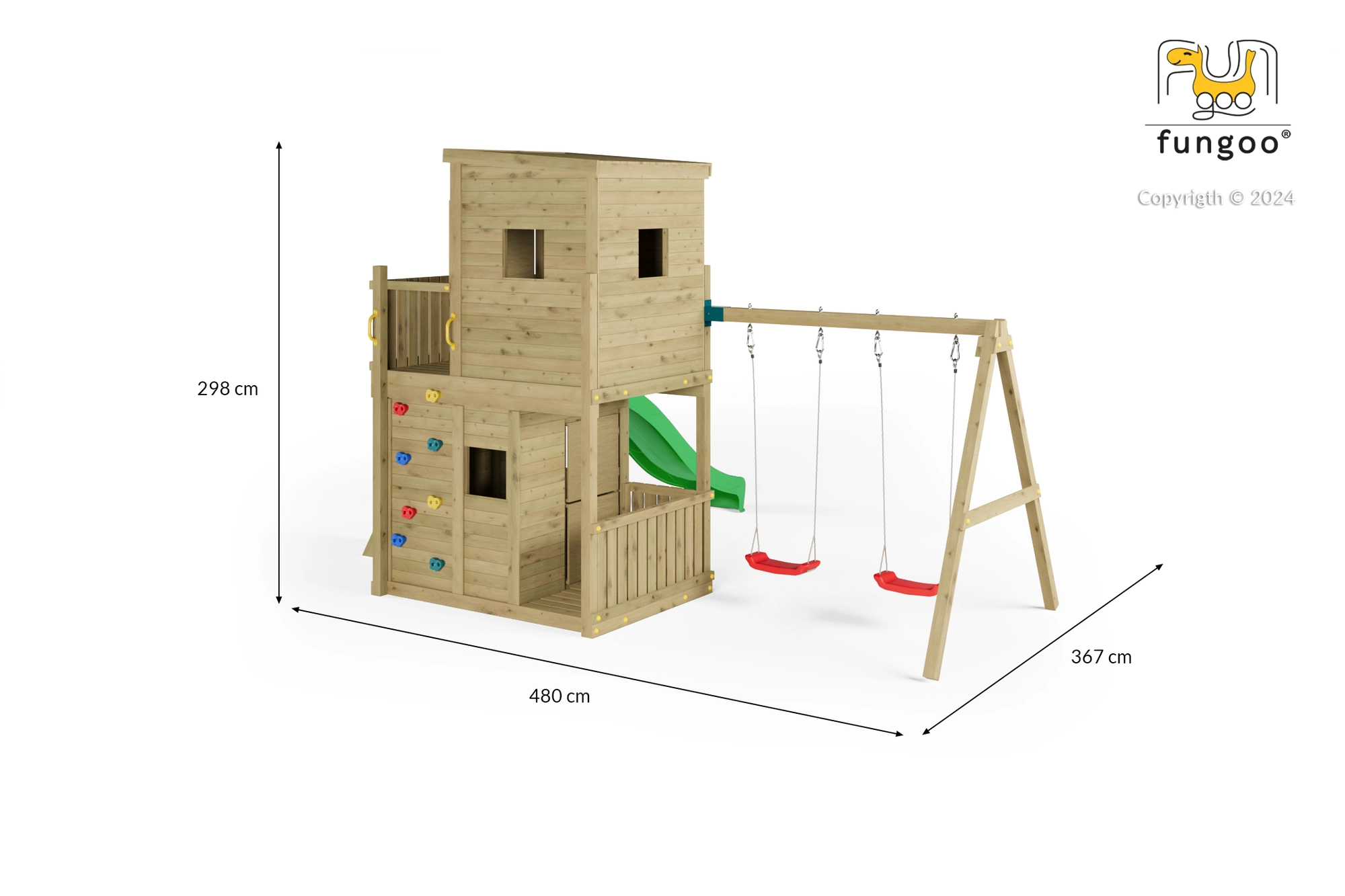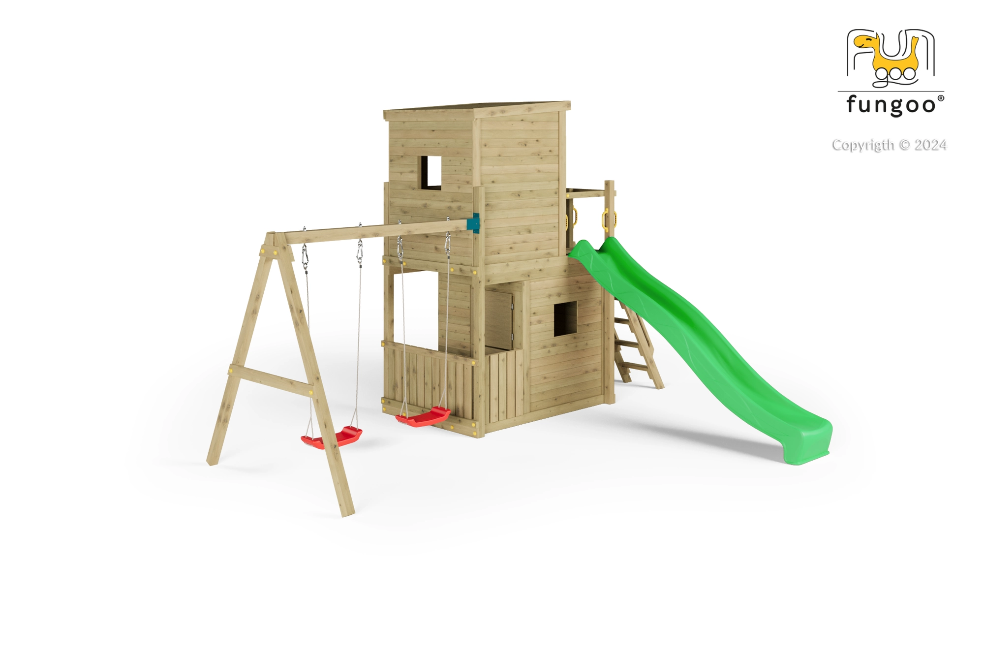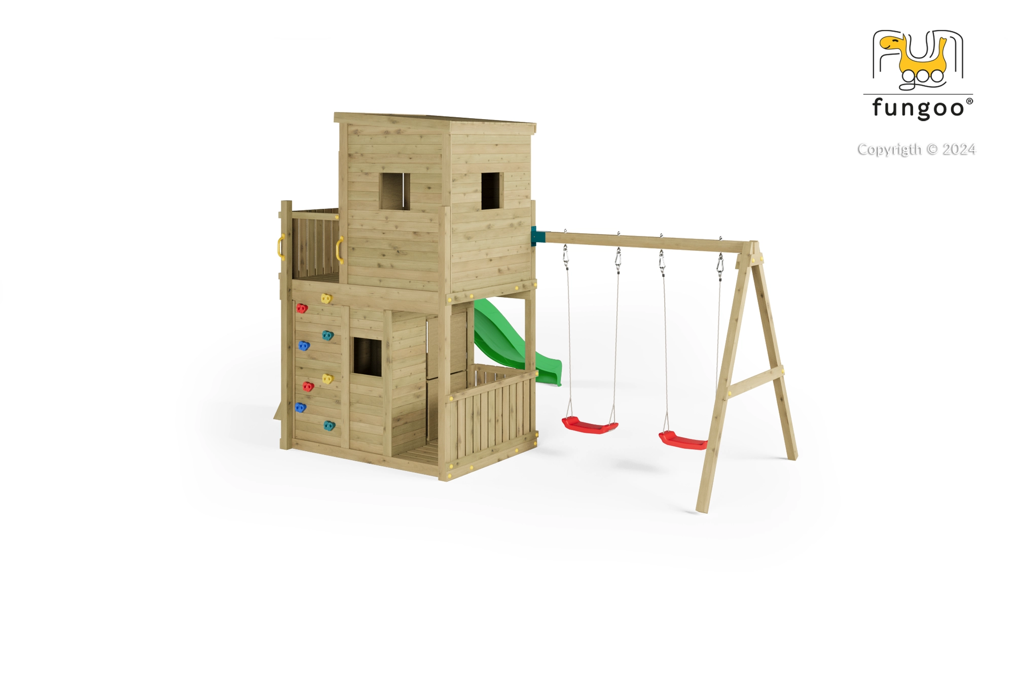Locul de joacă FUNGOO Lofter combină o structură stabilă din lemn cu o dotare bogată pentru distracție variată: căsuță înaltă cu acoperiș și ușiță, tobogan ondulat de 2,9 m, perete de cățărare cu prize, urcare comodă pe scări și cadru cu două leagăne. Datorită îmbinărilor de calitate, mânerelor de siguranță și elementelor de ancorare, întregul ansamblu este fixat solid și pregătit pentru utilizare zilnică.