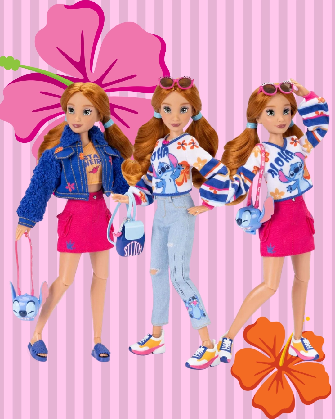 - Set bogat de accesorii: adidași și șlapi, ochelari de soare retro roz, rucsac, colier, poșetă în formă de cap Stitch și inel albastru sclipitor cu motiv MICKEY.