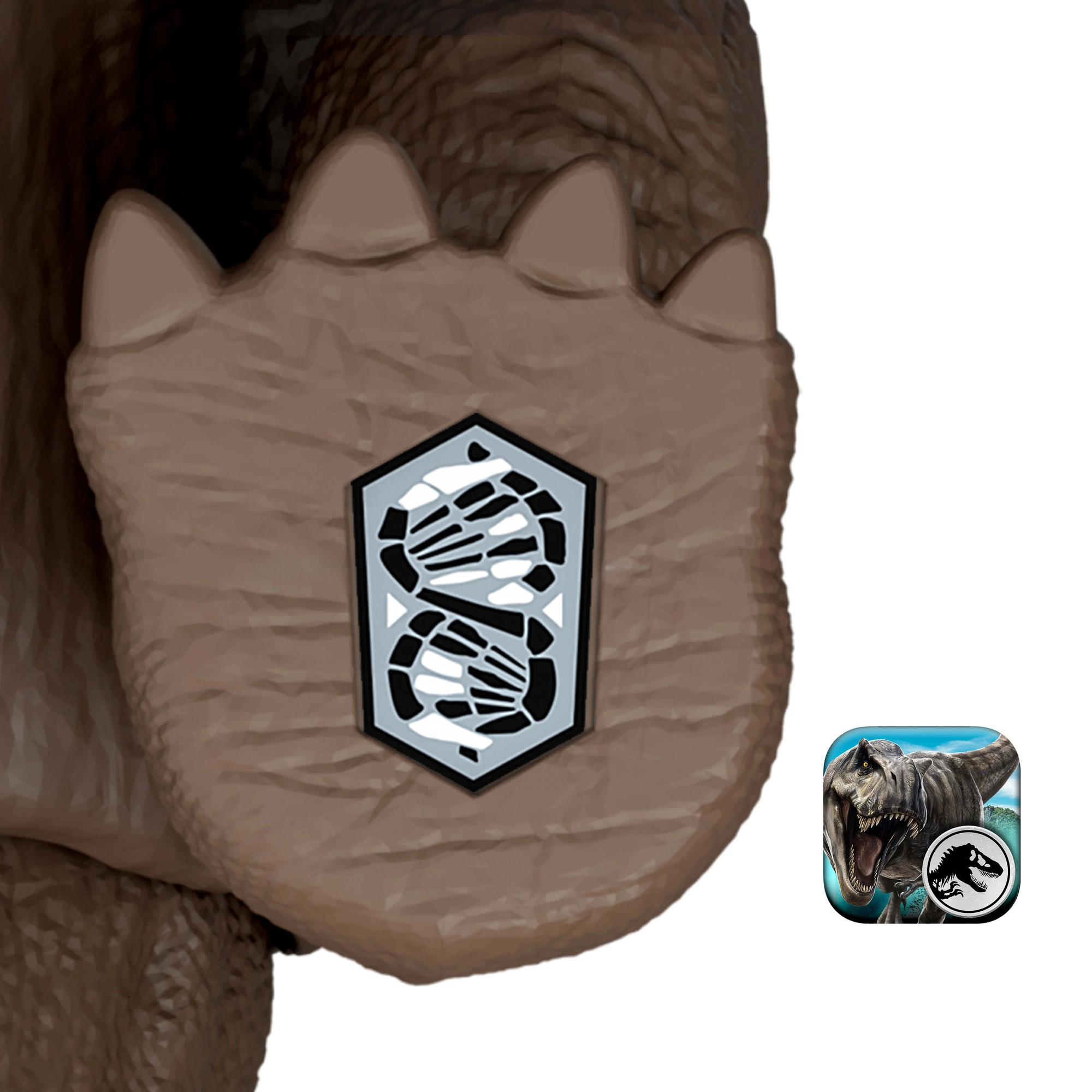 Distracție digitală în AR: scanează codul de urmărire de pe piciorul figurinei în aplicația gratuită Jurassic World Play (Android/iOS) și deblochează conținut în realitatea augmentată – extinde-ți colecția virtuală și dă viață aventurilor preistorice.