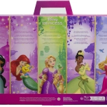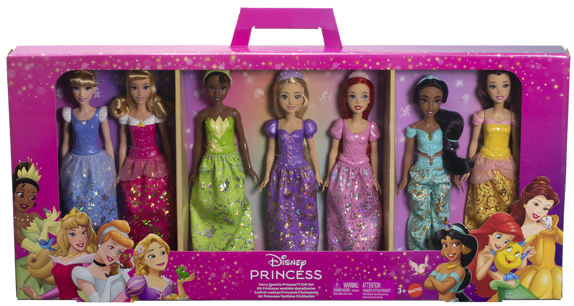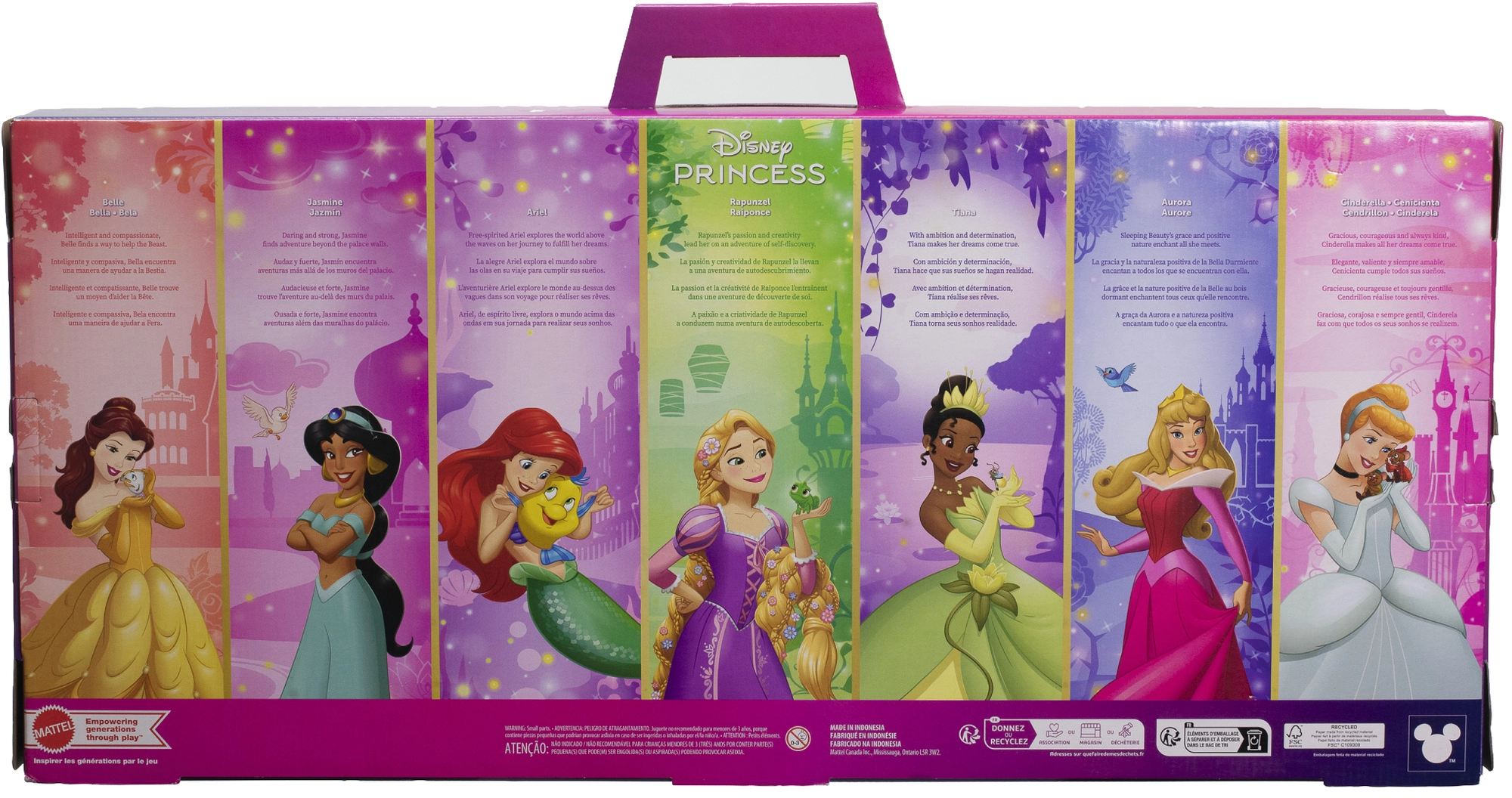 Acest set bogat reunește eroinele îndrăgite: ARIEL, AURORA, BELLE, CENUȘĂREASA, JASMINA, RAPUNZEL și TIANA. Fiecare păpușă impresionează prin detalii caracteristice inspirate din filme, țesături sclipitoare și accesorii elegante. Înălțimile diferite ale păpușilor și brațele și picioarele articulate permit poziționarea ușoară și crearea propriilor povești.