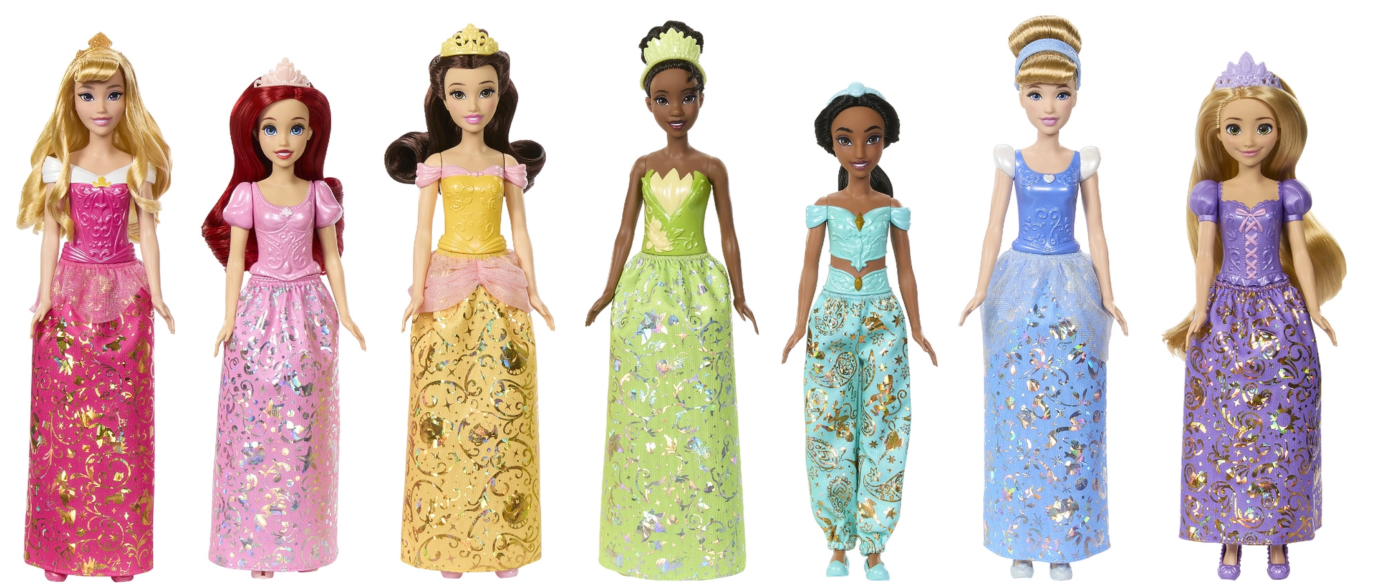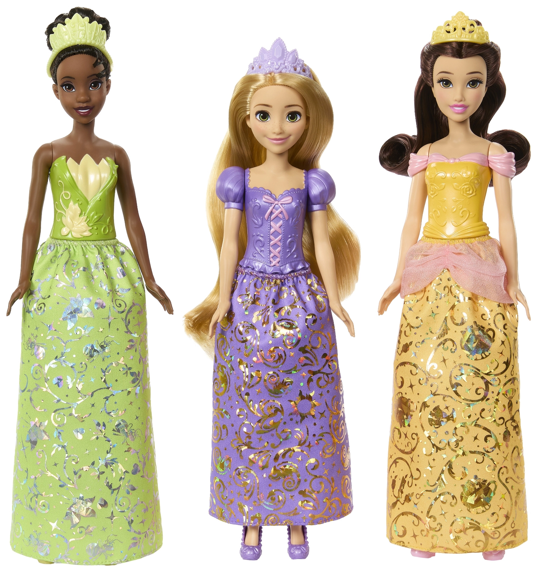 Fiecare păpușă are o fustă sau o ținută strălucitoare detașabilă, o coroană sau o bentiță și accesorii detaliate pentru schimbări de ținută pline de stil.