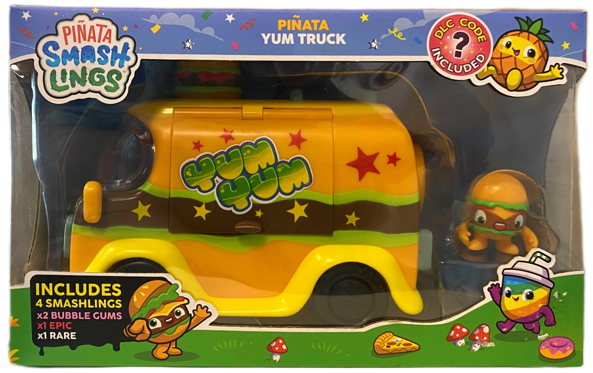 Descoperiți lumea tropicală a dulciurilor, unde din piniatele curcubeu prind viață ființele adorabile și pline de energie Smashlings. Acest set oficial Yum Truck Playset aduce un food truck stilat cu uși care se deschid și interior pregătit de party, patru figurine colorate (aprox. 3,5–4 cm) și trei accesorii „foodie” pentru servirea bunătăților. Datorită codului DLC deblocați în plus conținut unic în joc.