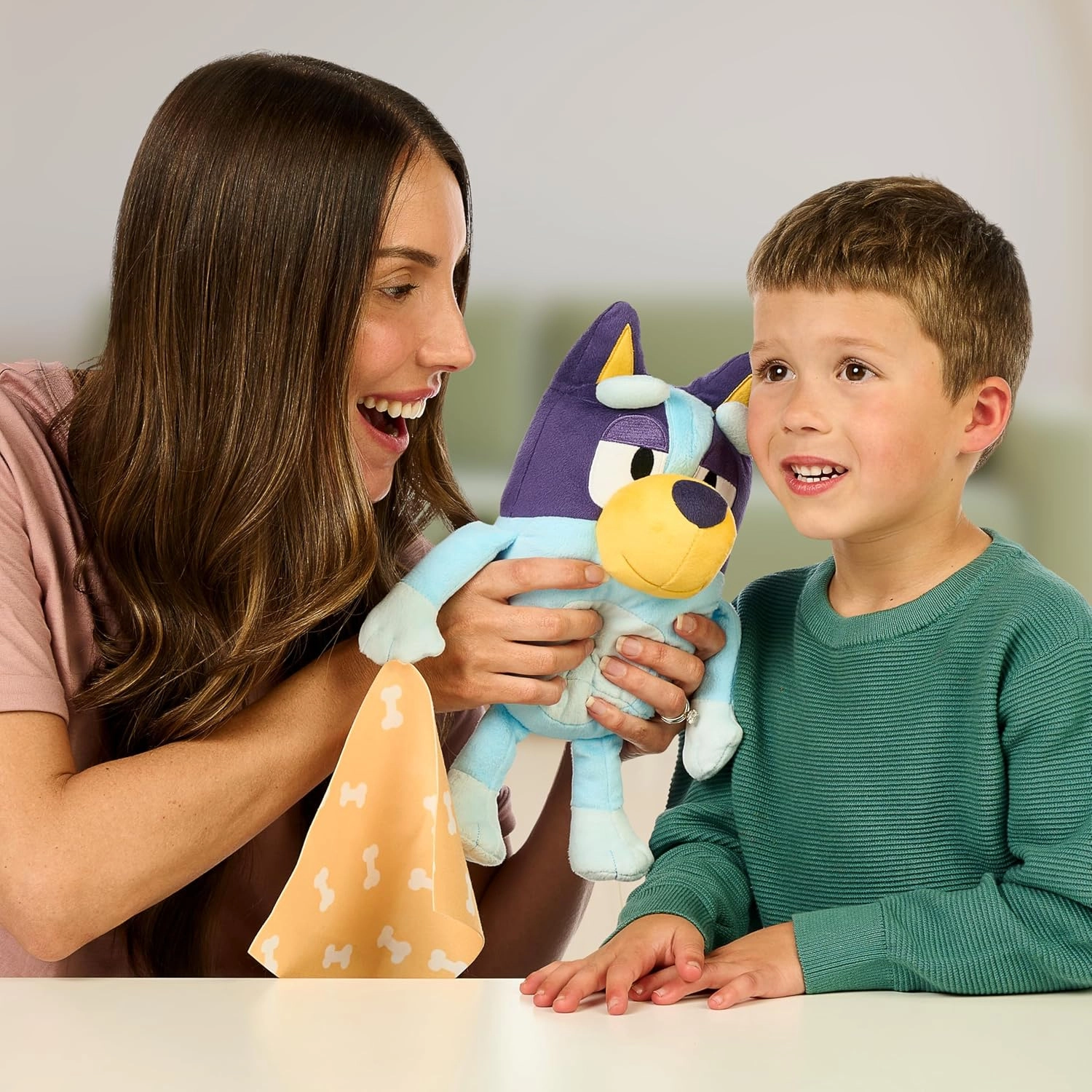La apăsarea burticii vei auzi 7 fraze amuzante și o melodie în engleză – grozav pentru momentele împreună înainte de culcare. Datorită dimensiunii de 30 cm, Bluey este perfectă pentru brațe, călătorii și pătuț.