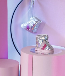 Pantofii cu șireturi și efect holografic cu elemente roz sunt un hit în moda pentru păpuși.