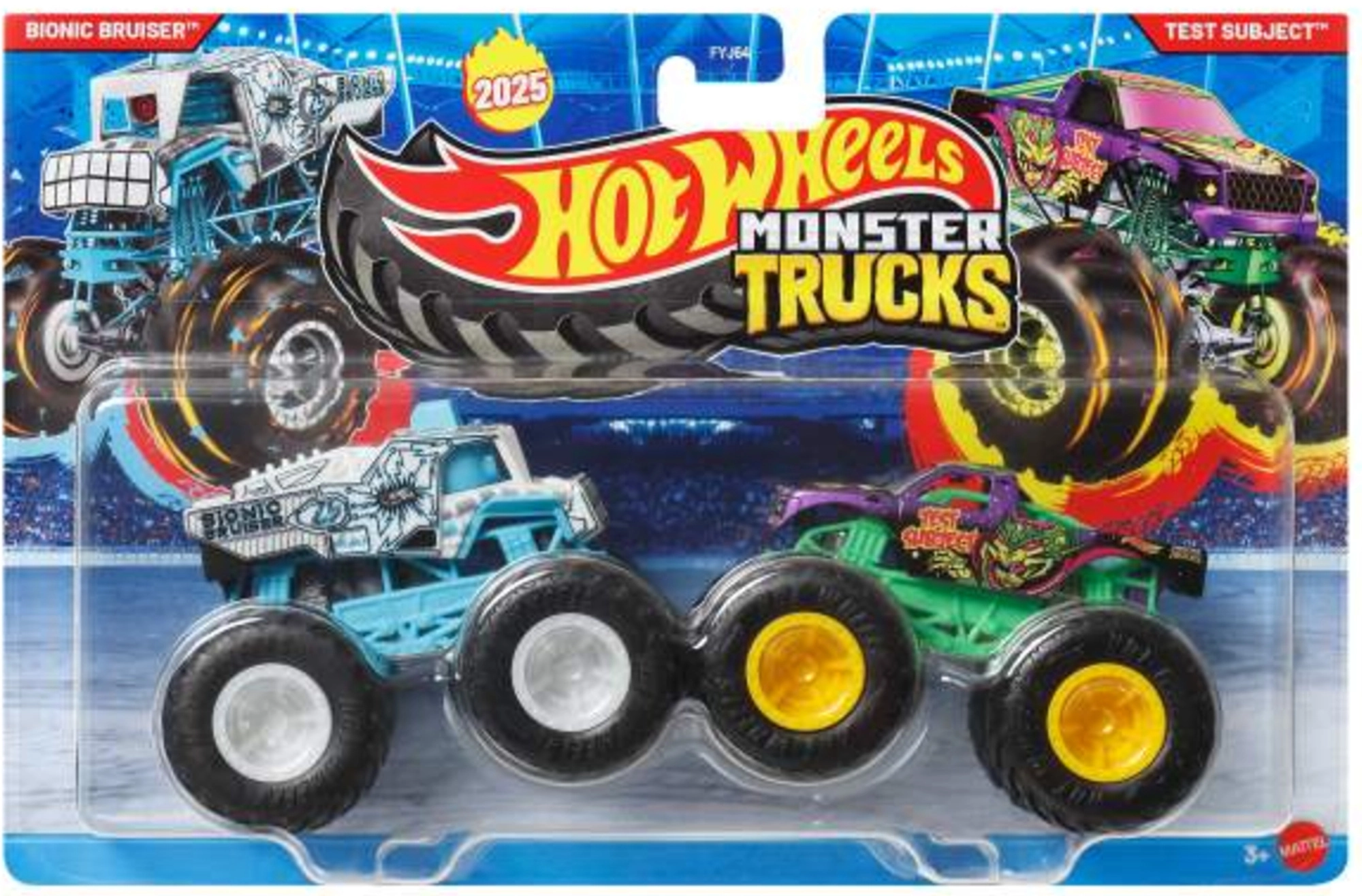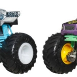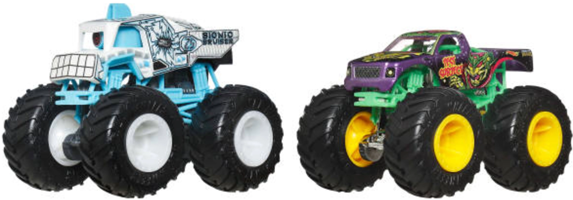 Acest set de două monster truck-uri din colecția Hot Wheels îi va încânta pe toți micii piloți. Modelul Bionic Bruiser atrage prin combinația alb-albastru cu elemente colorate, în timp ce Test Subject surprinde cu vopseaua verde-mov și inscripții spectaculoase. Ambele vehicule au o construcție solidă și durabilă, datorită căreia rezistă la lovituri și curse nebune.