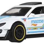 Caroserie albă, dungi albastre de curse și elemente aerodinamice care asigură un aspect realist pentru joacă și pentru colecție.