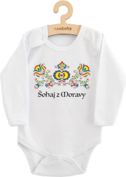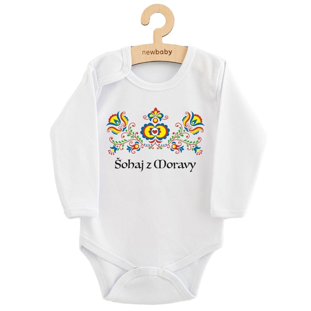 Body stilat pentru bebeluși cu mânecă lungă și motiv folcloric „Flăcău din Moravia” de la marca New Baby îmbină tradiția cu designul modern. Realizat din 100% bumbac pentru finețe și respirabilitate, cu închidere practică cu capse la umăr și între piciorușe. Culori certificate potrivite pentru bebeluși și material cu OEKO-TEX Standard 100 pentru siguranță și confort în fiecare zi.