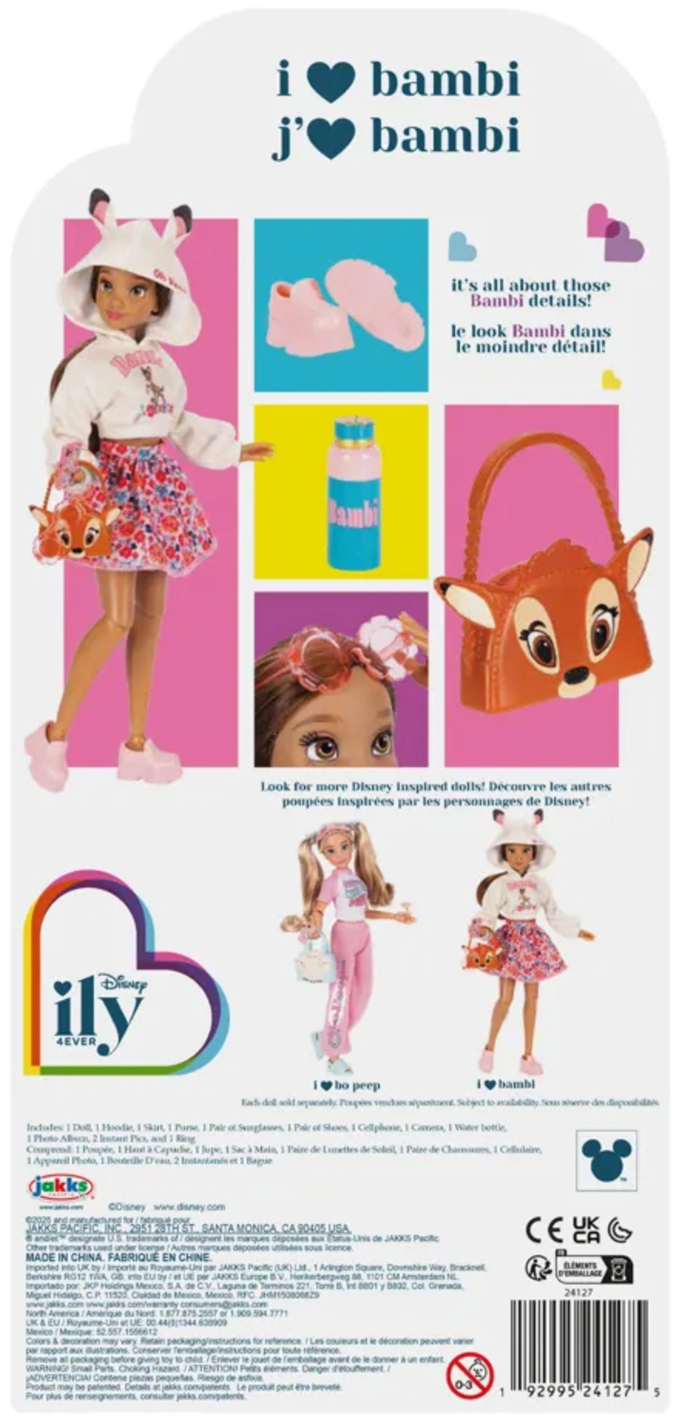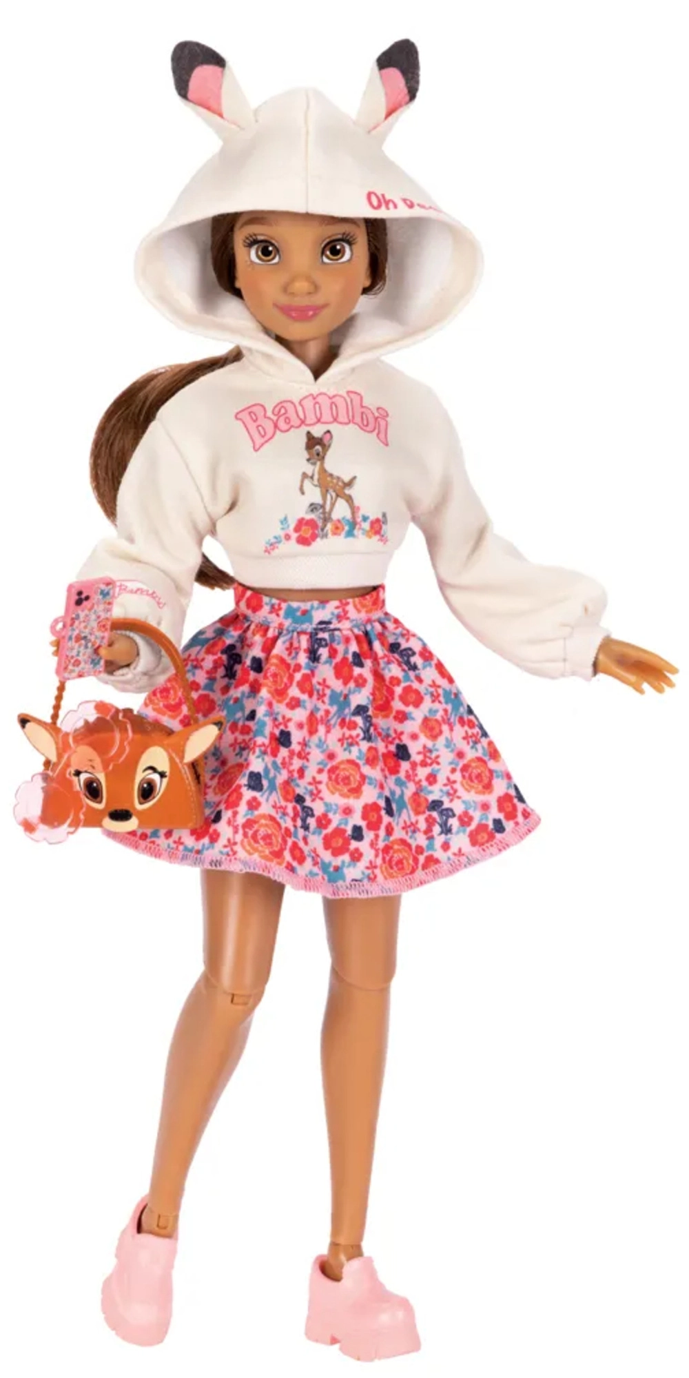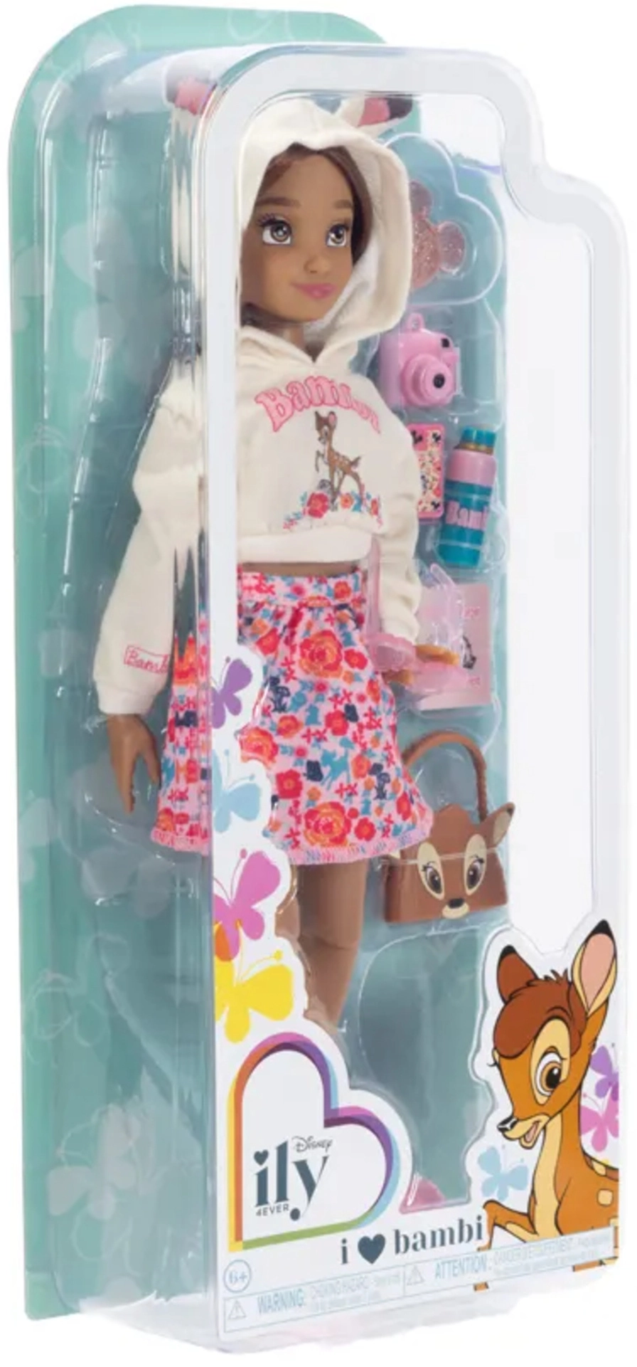 Descoperă lumea modei și a fanteziei cu păpușa DISNEY ILY 4Ever inspirată de personajul Bambi. Fusta delicată cu flori, hanoracul crem cu glugă și urechiușe și adidașii roz creează un look adorabil, de pădure. Datorită celor 13 puncte de articulație, păpușa adoptă cu ușurință poziții dinamice care stimulează imaginația și jocul de poveste.