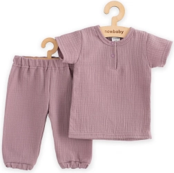 Set din muselină ușor și respirabil pentru bebeluși de la New Baby, combinând un tricou cu mânecă scurtă și pantaloni cu elastic confortabil. Ideal pentru primăvară și vară, realizat din 100% bumbac cu certificare OEKO-TEX STANDARD 100. Oferă material moale și fin, îmbrăcare ușoară cu capse și croială modernă pentru confort maxim în fiecare zi.
