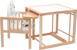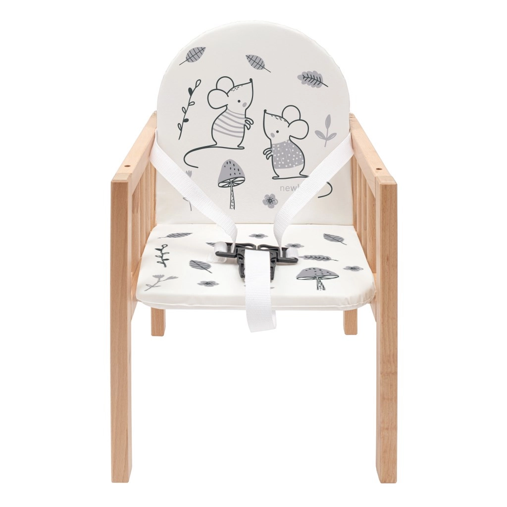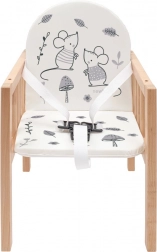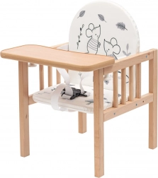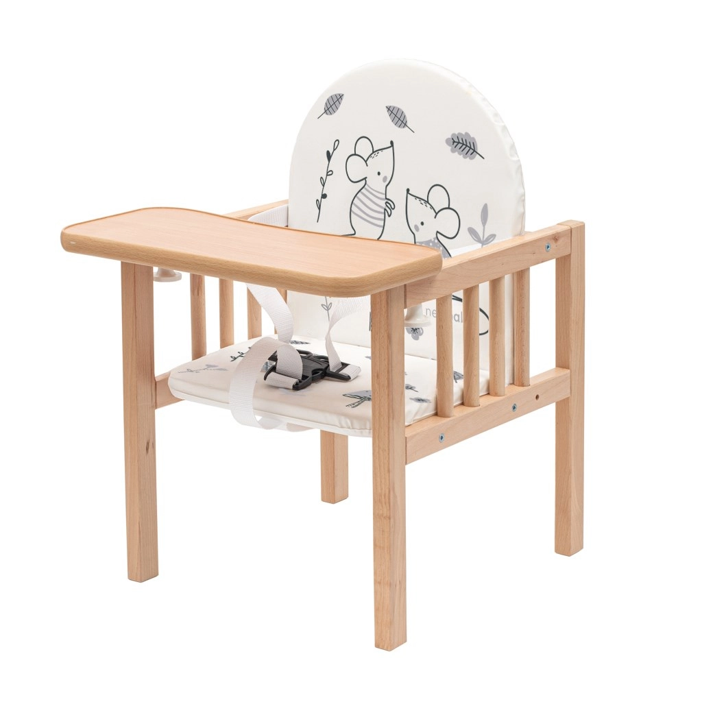 Scăunel de masă pentru copii 2‑în‑1 NEW BABY Jerry din lemn de fag solid, practic și sigur. Poate fi transformat într-o măsuță și un scăunel separate, are tapițerie confortabilă cu motive pentru copii și tavă ușor de curățat. Siguranța este asigurată de centura de siguranță în 3 puncte și de construcția stabilă cu durată lungă de viață. Ideal pentru hrănire, joacă și desen.