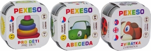 Pexeso este unul dintre cele mai populare jocuri pentru copii, care de asemenea ajută la dezvoltarea lor. Acest set conține trei tipuri diferite de pexeso în cutii metalice, axate pe abecedar, animăluțe cu engleză și jocuri pentru copii.