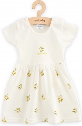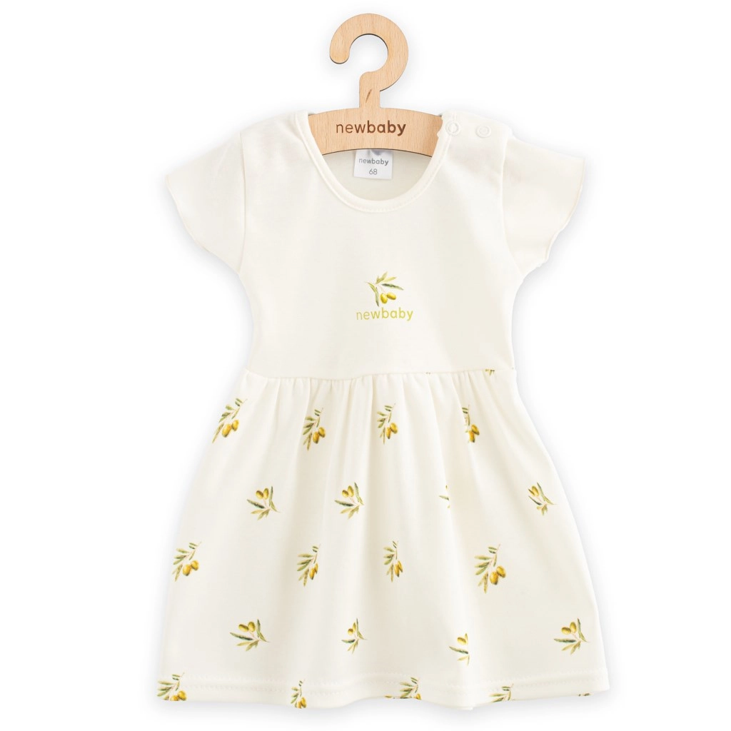 Rochiță adorabilă pentru bebeluși New Baby cu imprimeu de măsline, confecționată din 100% bumbac organic moale. Ușoară, respirabilă și plăcută pe piele, cu închidere cu capsă pentru îmbrăcare ușoară. Certificarea OEKO-TEX STANDARD 100 garantează siguranță pentru pielea sensibilă a copiilor.