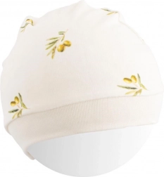 Căciuliță moale pentru bebeluși din bumbac organic New Baby cu motiv de măsline oferă finețe pentru pielea sensibilă, margine mai lată care nu strânge și o execuție de calitate. O alegere excelentă pentru bebeluși și alergici datorită certificării OEKO-TEX STANDARD 100.