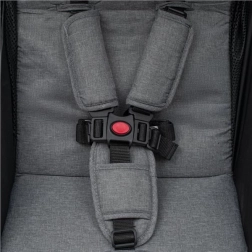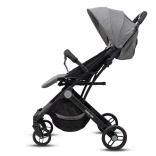 Rezistentul cadru din aluminiu cu finisaj negru pulbere asigură greutate redusă și durabilitate. Spătarul reglabil de la șezut la semi-înclinată și suportul de picioare ajustabil oferă confort copilului în creștere. Bariera de protecție detașabilă facilitează așezarea și ridicarea copilului, iar frâna comună pe roțile din spate asigură staționare sigură.