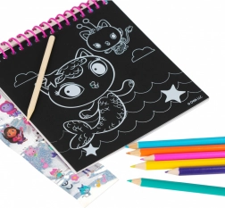 - Caiet spirală cu șabloane, 6 creioane colorate, 1 autocolant, 1 bețișor pentru zgâriere