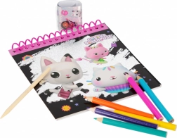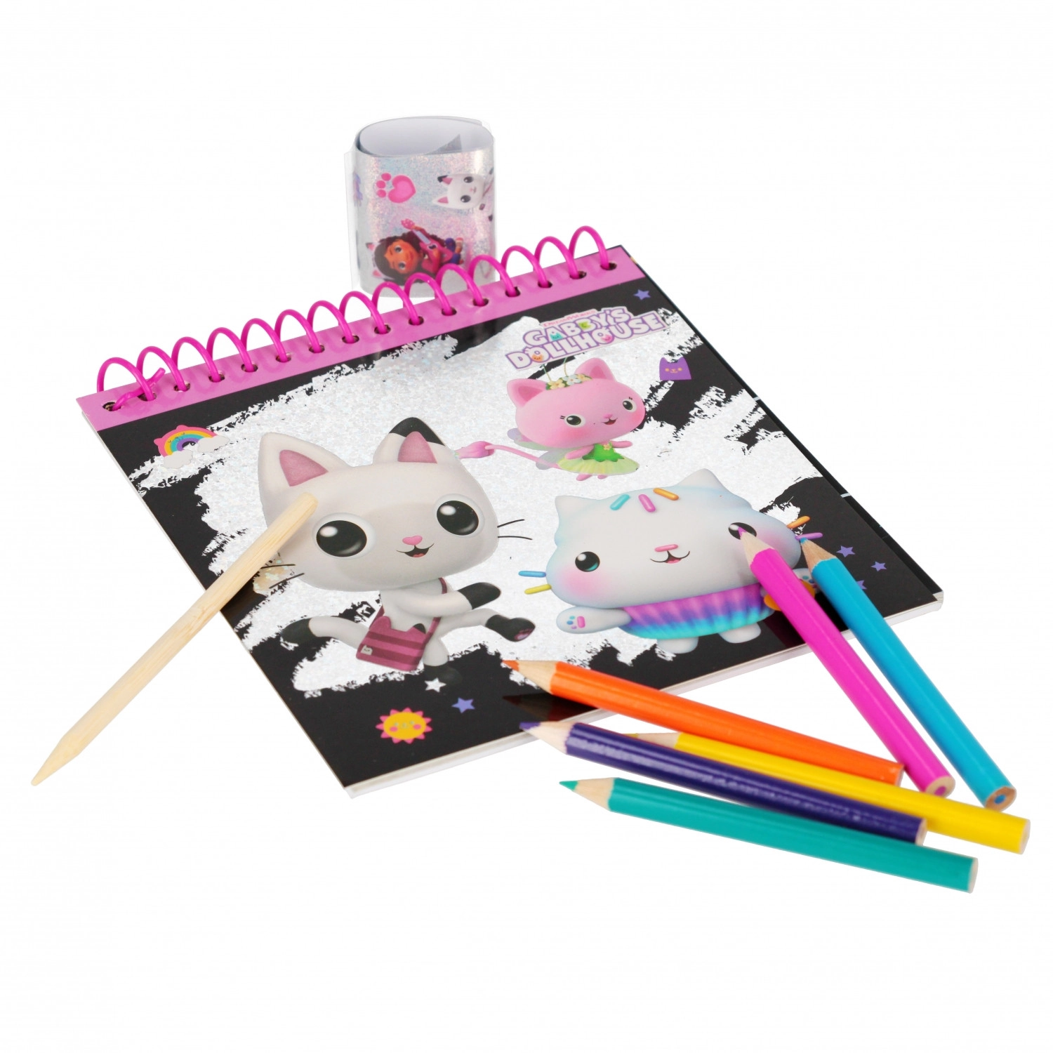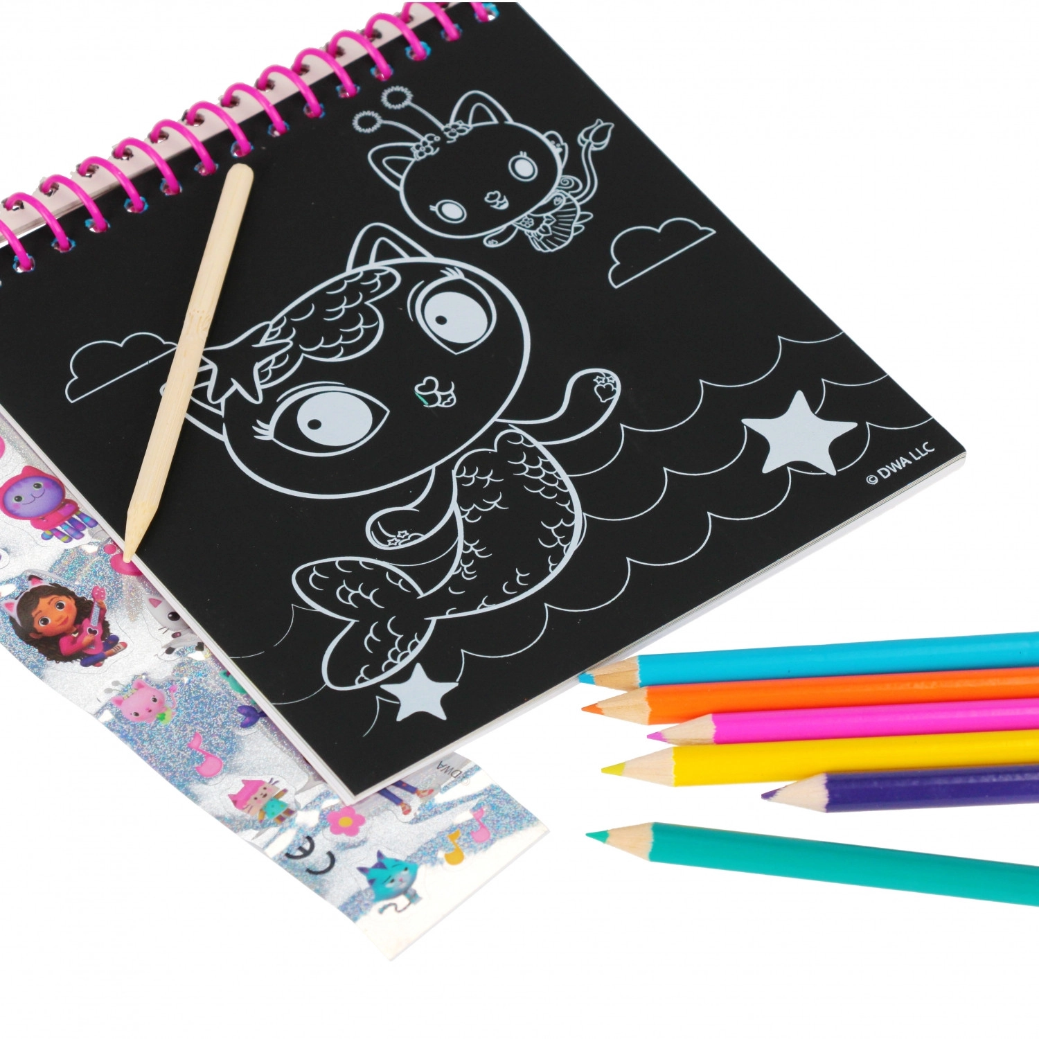Dă viață imaginației copiilor cu un set creativ inspirat de îndrăgita lume Gabby's Dollhouse. Datorită șabloanelor cu contururi, copiii pot crea cu ușurință imagini colorate prin zgâriere și colorare. Caietul practic cu spirală păstrează toate foile împreună – ideal acasă și în călătorii.
