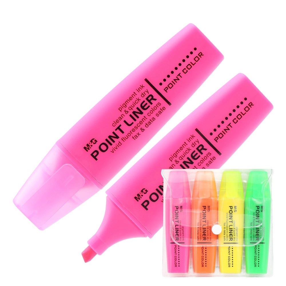 Descoperă subliniatoarele fluorescente M&G cu aromă plăcută într-un set practic de 4 culori. Datorită vârfului teșit poți trasa linii subțiri și groase cu ușurință, iar cerneala pe bază de apă, cu uscare rapidă nu lasă urme. Tehnologia anti-uscarea prelungește durata de viață. Sigure pentru documente imprimate în culorile preferate: roz, portocaliu, galben și verde.
