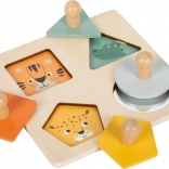 Această jucărie de tip sortator este concepută pentru mânuțele celor mici. Fiecare dintre cele patru piese colorate are un butonaș practic din lemn, astfel încât se ține confortabil și se potrivește ușor în deschiderile corespunzătoare. Sub forme, copiii descoperă ilustrații simpatice cu tigru, crocodil și leopard, precum și o oglindă sigură care stimulează curiozitatea și interacțiunea prin joacă.