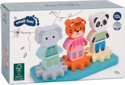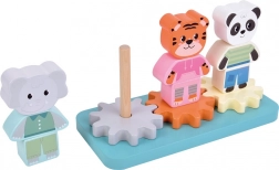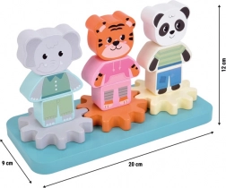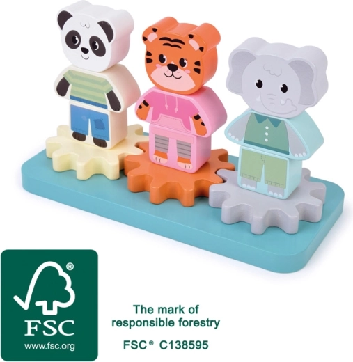 Trei figurine adorabile – elefant, tigru și panda – sunt formate din piese colorate, stivuibile, pe care copiii le pot sorta, combina și așeza una peste alta. Un sistem ingenios de roți dințate conectează toate figurinele: prin rotirea uneia se pun în mișcare toate, astfel încât copiii văd instantaneu cauza și efectul.