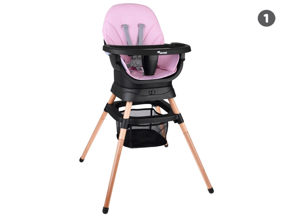 Sistemul modular permite reconfigurarea rapidă fără unelte: scaun înalt de masă, scaun jos cu tăviță, fotoliu independent, suprăstructură pentru scaunul de masă cu centuri de prindere, taburet înalt și taburet jos. Spațiul de sub scaun este completat de un coș practic pentru mărunțișuri.
