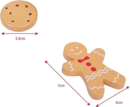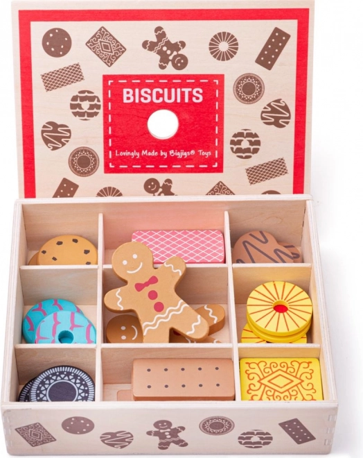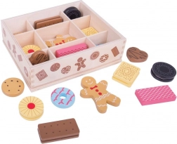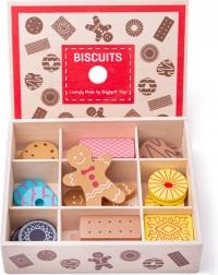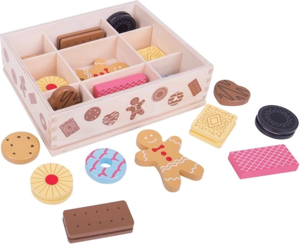 Prezentăm cutia de lemn cu jucării de biscuiți, care conține un sortiment de biscuiți preferați, inclusiv turtă dulce și multe altele. Acest set permite copiilor mici să-și dezvolte creativitatea prin joc inspirat de coacere.