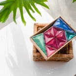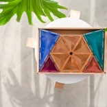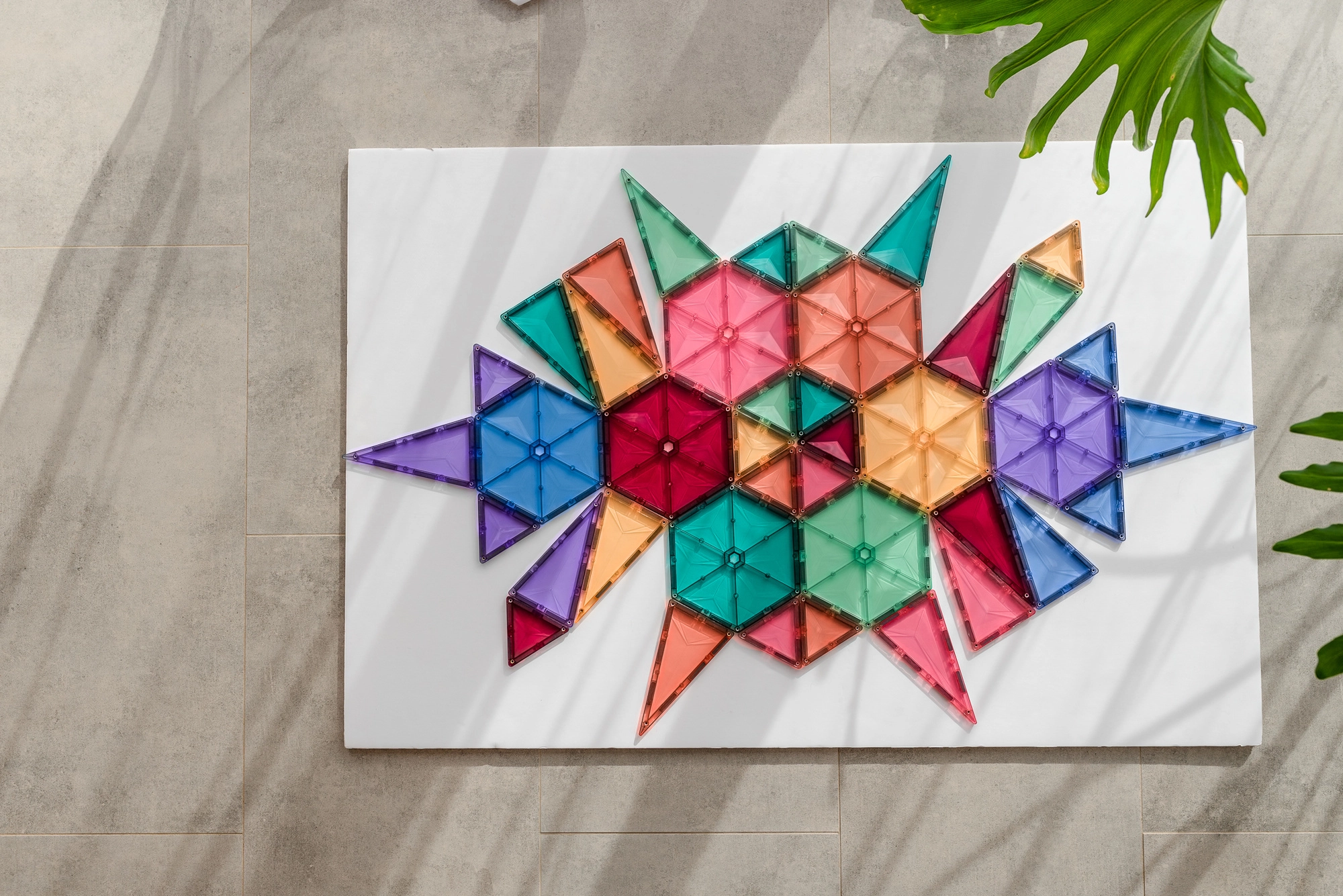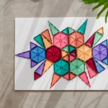 Formele geometrice translucide în culori delicate invită la crearea de modele, explorarea luminii și culorilor și la descoperirea geometriei într-un mod distractiv.