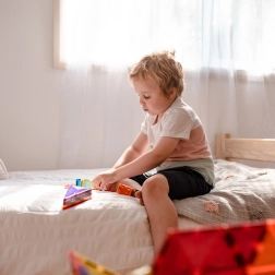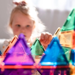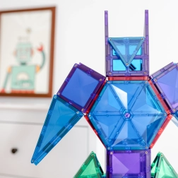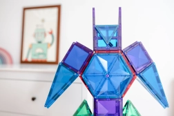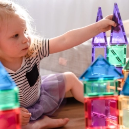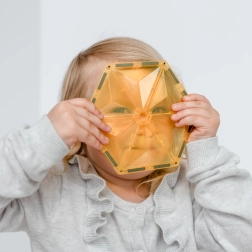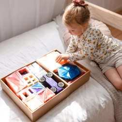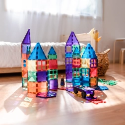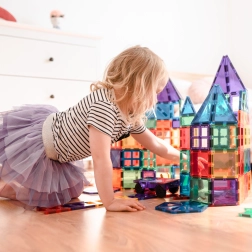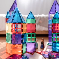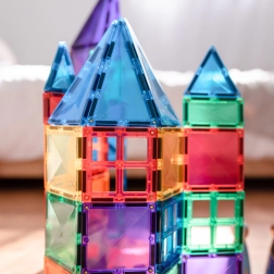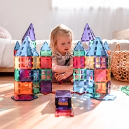 Plăcuțele magnetice transparente, în culori saturate, le permit copiilor să creeze turnuri înalte, castele și case și să descopere jocul cu lumini și umbre la fereastră sau cu o lampă.