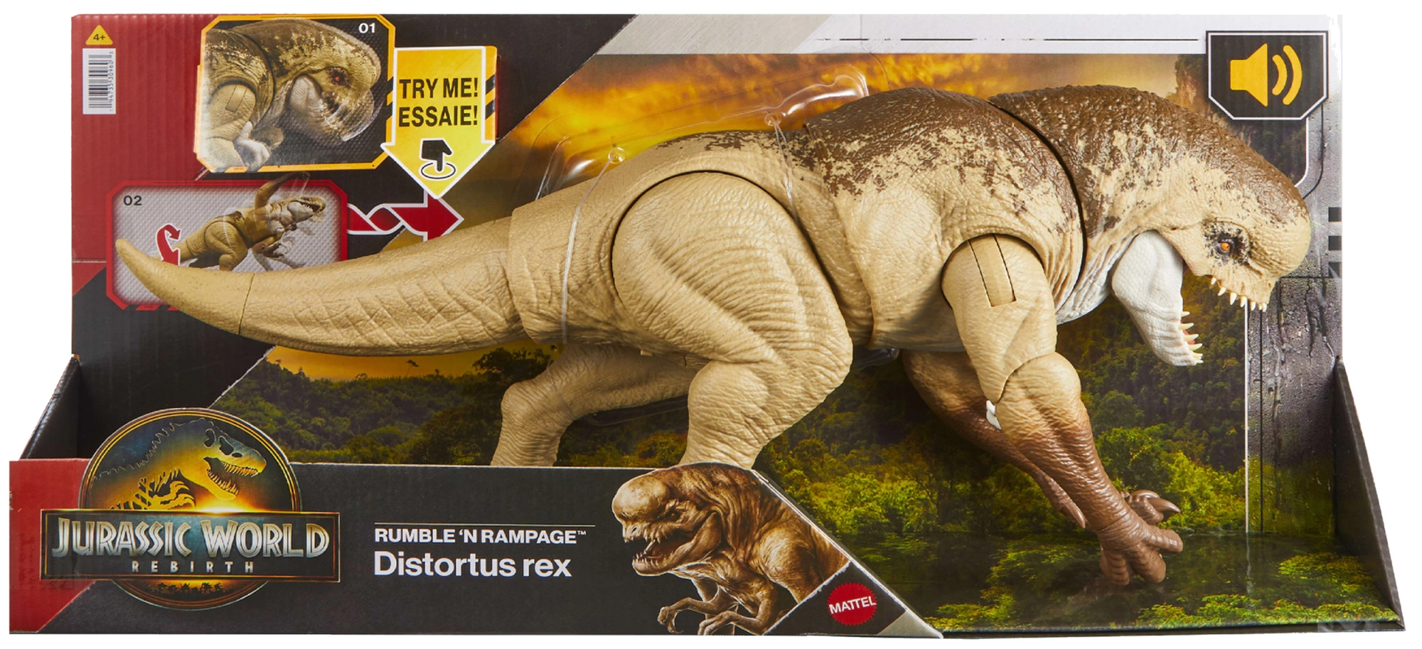 Pregătește-te pentru lupte grandioase cu figurina realistă Distortus Rex, înaltă de aproximativ 50 cm, din seria JURASSIC WORLD Rebirth de la Mattel. Dinozaurul oferă un urlet înfricoșător la apăsarea butonului, mușcătură cu mișcarea membrelor anterioare și lovitură laterală controlată din coadă. Datorită texturii detaliate a pielii, articulației extinse și interacțiunii AR în aplicație, este un cadou perfect pentru micii aventurieri și fanii dinozaurilor.