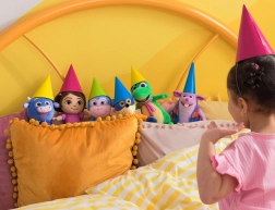 Ochi și zâmbet brodate, fără piese mici, oferă joacă sigură și blândă chiar și pentru copiii mai mici.