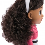 Păpușa este realizată din materiale rezistente și oferă articulații mobile pentru poziționare ușoară. Ținuta stilată – tricou în dungi, cardigan roz, pantaloni albaștri cu aplicație cu pisică și pantofi roz – adaugă un plus de farmec jocului.