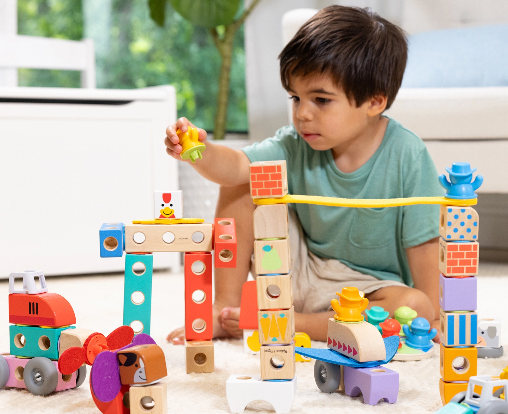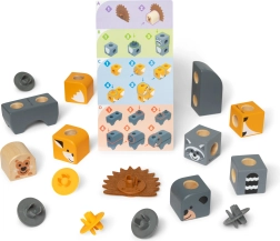 Blocurile ilustrate cu orificii și elemente de îmbinare invită la sortare, înșirare și potrivire. Copiii exersează recunoașterea formelor și a modelelor, precum și motricitatea fină.