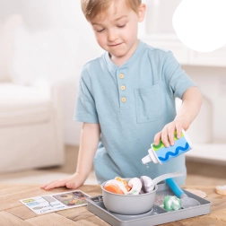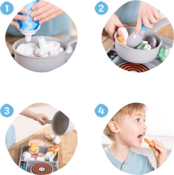 Tava cu imitație de plită, oala și lingura de amestecat creează un mediu realist pentru joaca de-a bucătarul. Copiii pot amesteca, turna și servi ca într-o bucătărie adevărată.