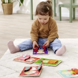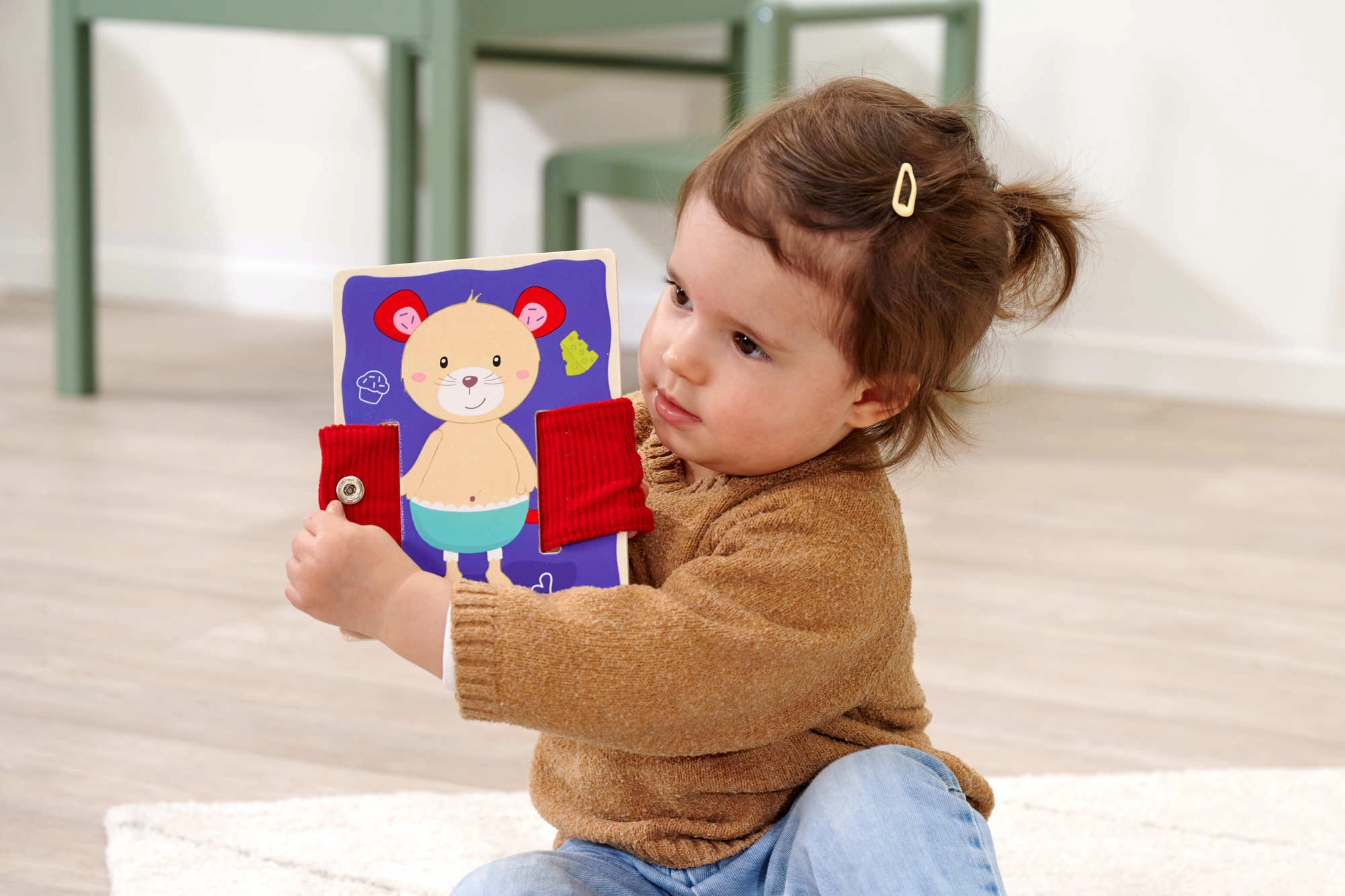 Fiecare tăbliță prezintă un alt tip de închidere – copiii exersează fermoarul, capsele, cataramele, nasturii și șiretuitul, câștigând siguranță la îmbrăcare.