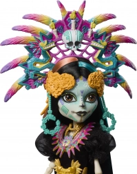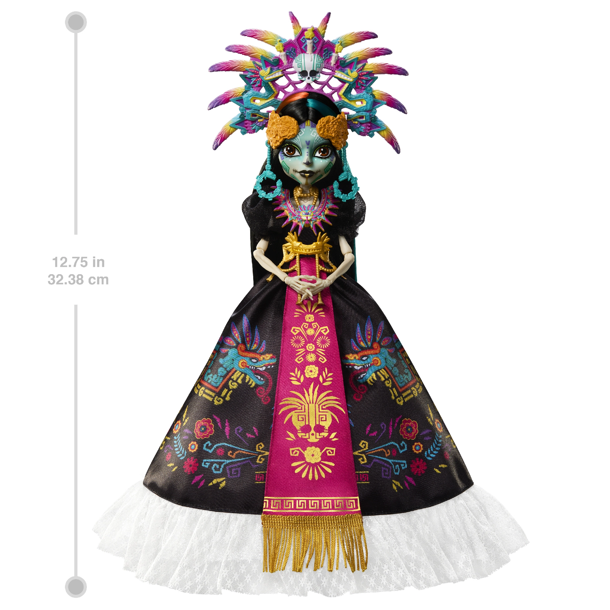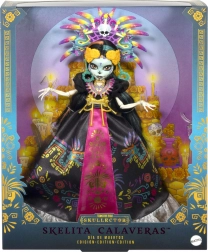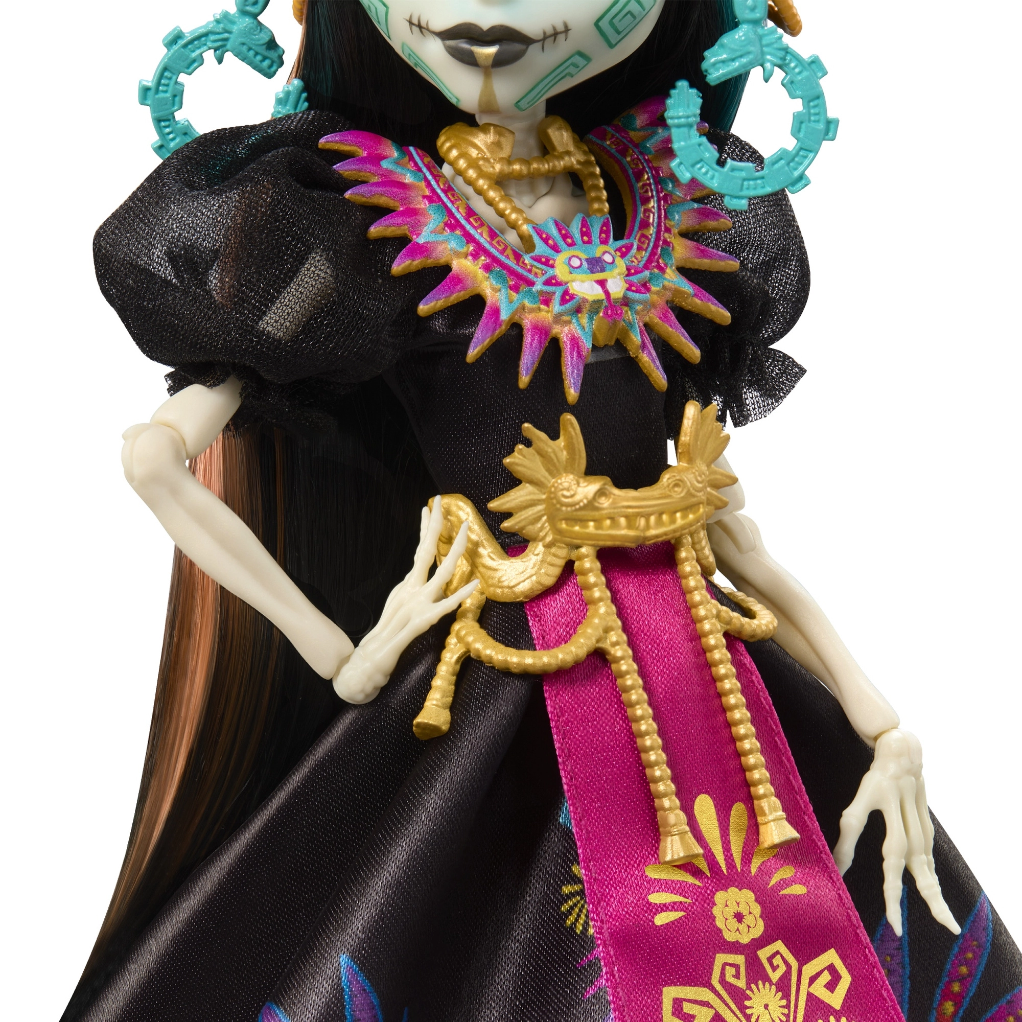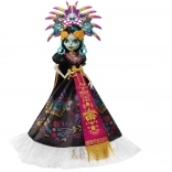Ediția de colecție Monster High Skullector aduce un omagiu sărbătorii mexicane Día de Muertos. Skelita Calaveras încântă prin rochia lungă neagră cu luciu satinat, imprimeuri colorate și eșarfă magenta proeminentă cu franjuri aurii. Diadema cu pene impunătoare, bijuteriile statement și face paint-ul detaliat o transformă într-o piesă remarcabilă pentru fanii designului și ai culturii.