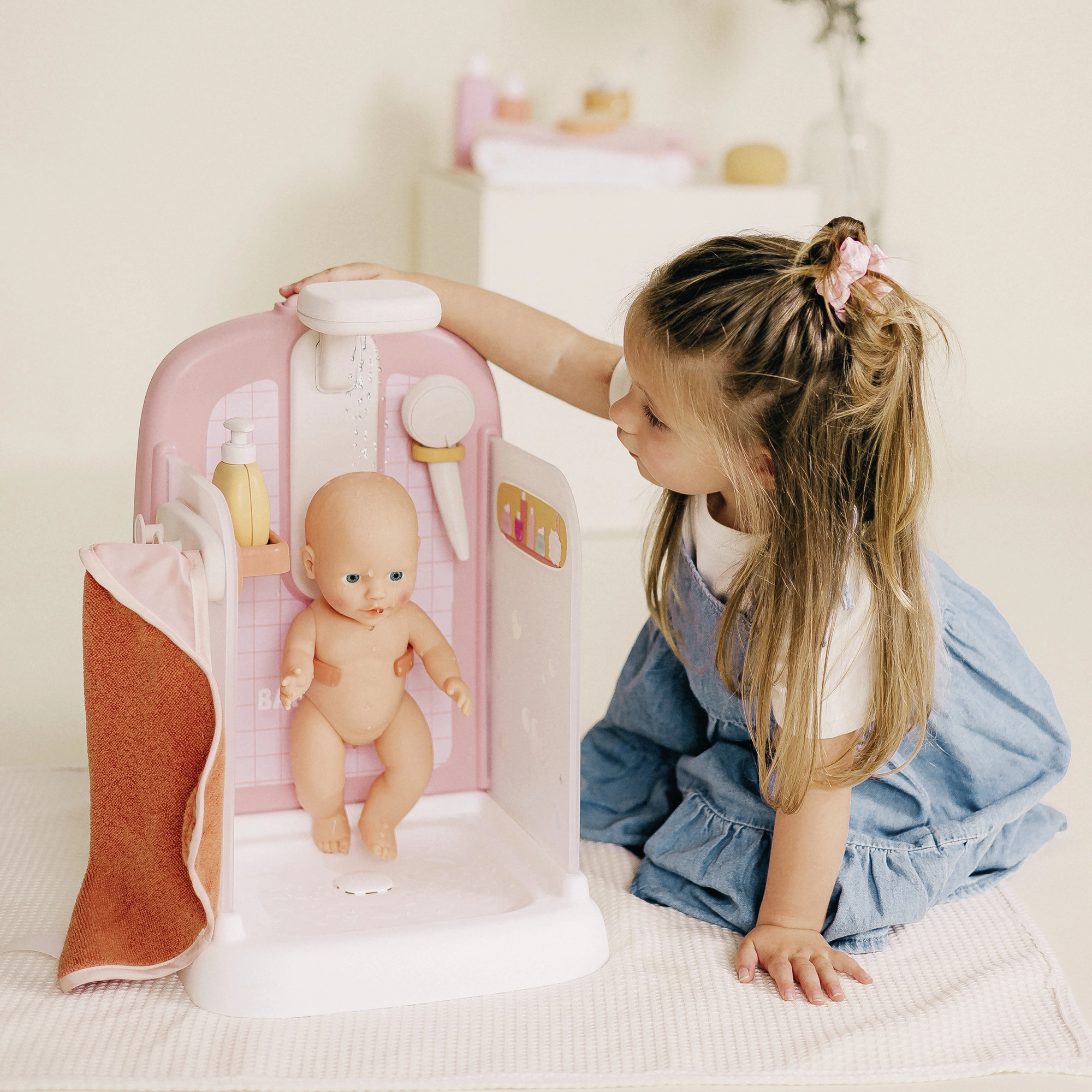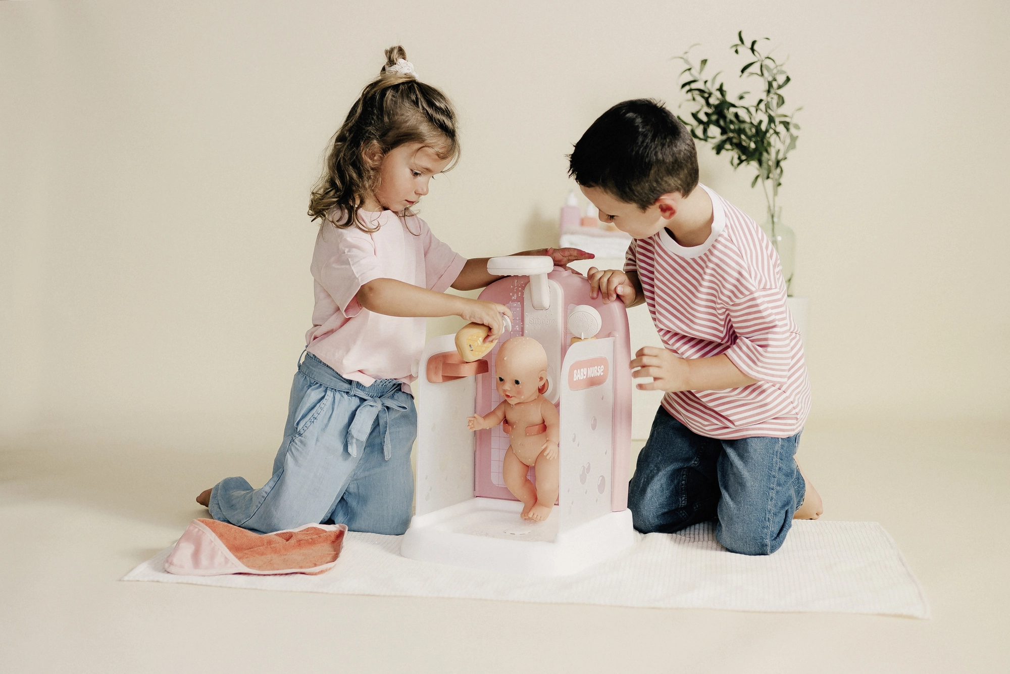 Descoperă îngrijirea realistă a păpușii cu eleganta cabină de duș roz-alb BABY NURSE. La apăsarea butonului, apa începe să curgă din duș, astfel încât copiii pot „îmbăia” cu adevărat păpușa și apoi o pot înfășura în prosopul moale cu glugă. Datorită suportului practic, păpușa poate sta singură sub duș, iar copiii au mâinile libere pentru spălare și clătire.