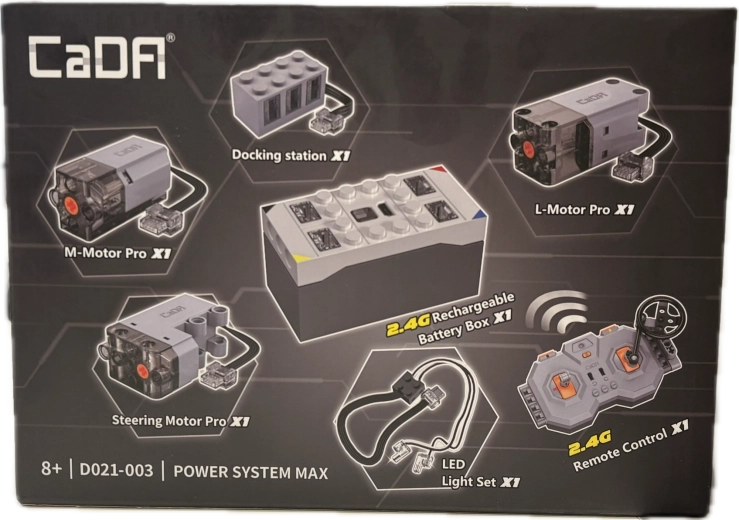 Extindeți seturile CADA cu propulsie și iluminare realiste datorită setului Power System Max. Obțineți control precis pe 2,4 GHz fără interferențe, autonomie lungă a acumulatorului și compatibilitate cu multe modele de dimensiune standard. În pachet găsiți trei motoare puternice, iluminare LED, telecomandă și cablu de încărcare USB – tot ce aveți nevoie pentru a duce distracția la un nou nivel.