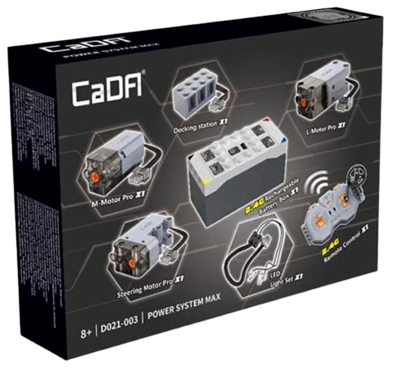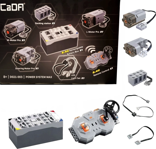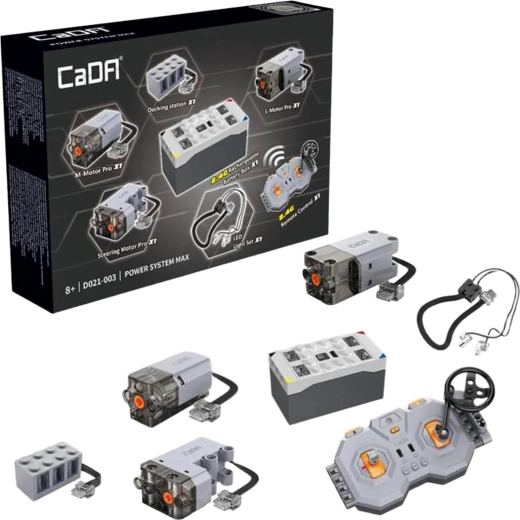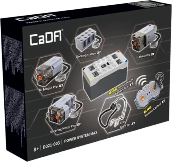 Extinde-ți seturile de construcție cu un sistem de propulsie realist și control de la distanță 2,4 GHz folosind setul CaDA Power System MAX. Pachetul include un acumulator, trei motoare Pro performante (M, L, Direcție), iluminare LED, telecomandă și cablu de încărcare USB pentru distracție îndelungată și fără interferențe.
