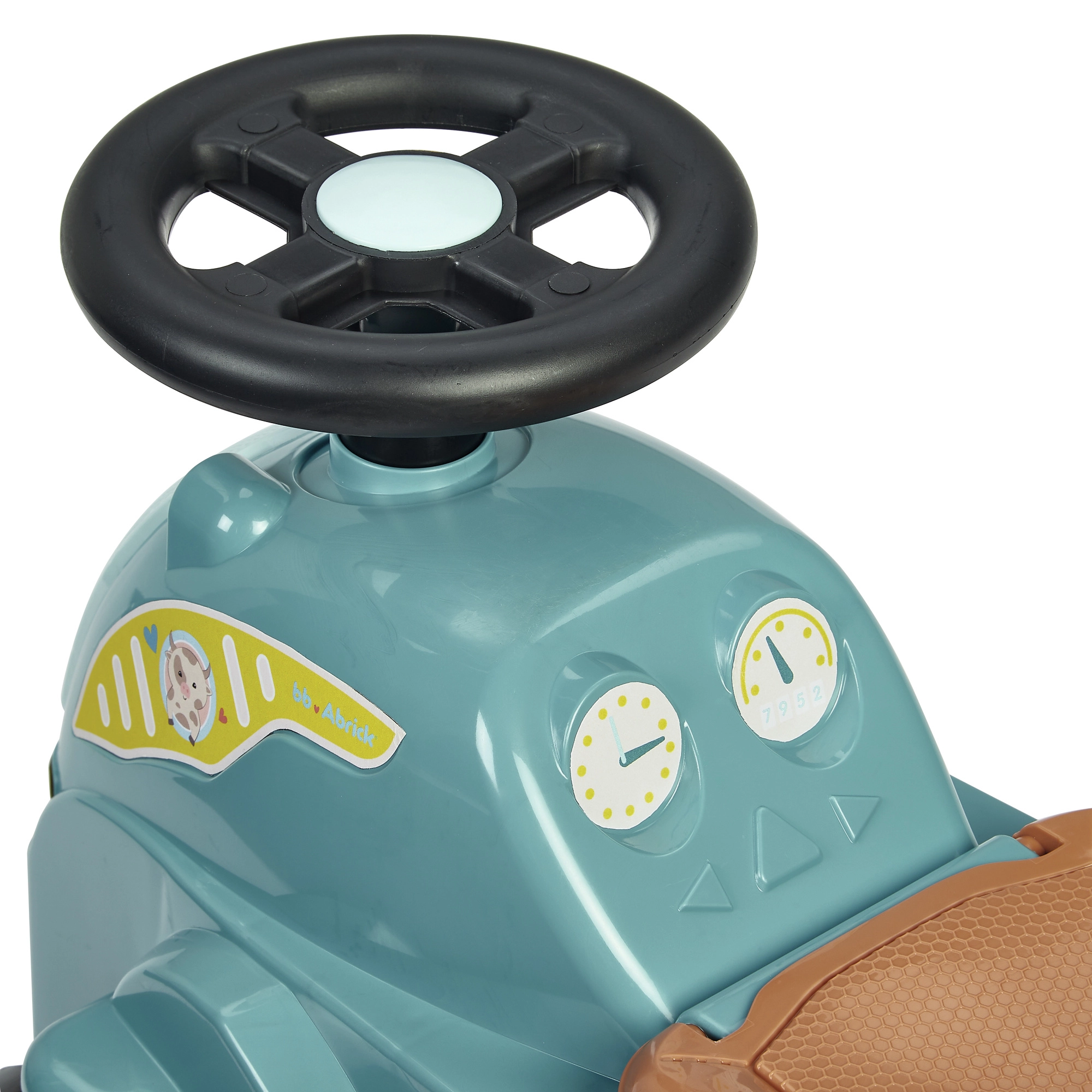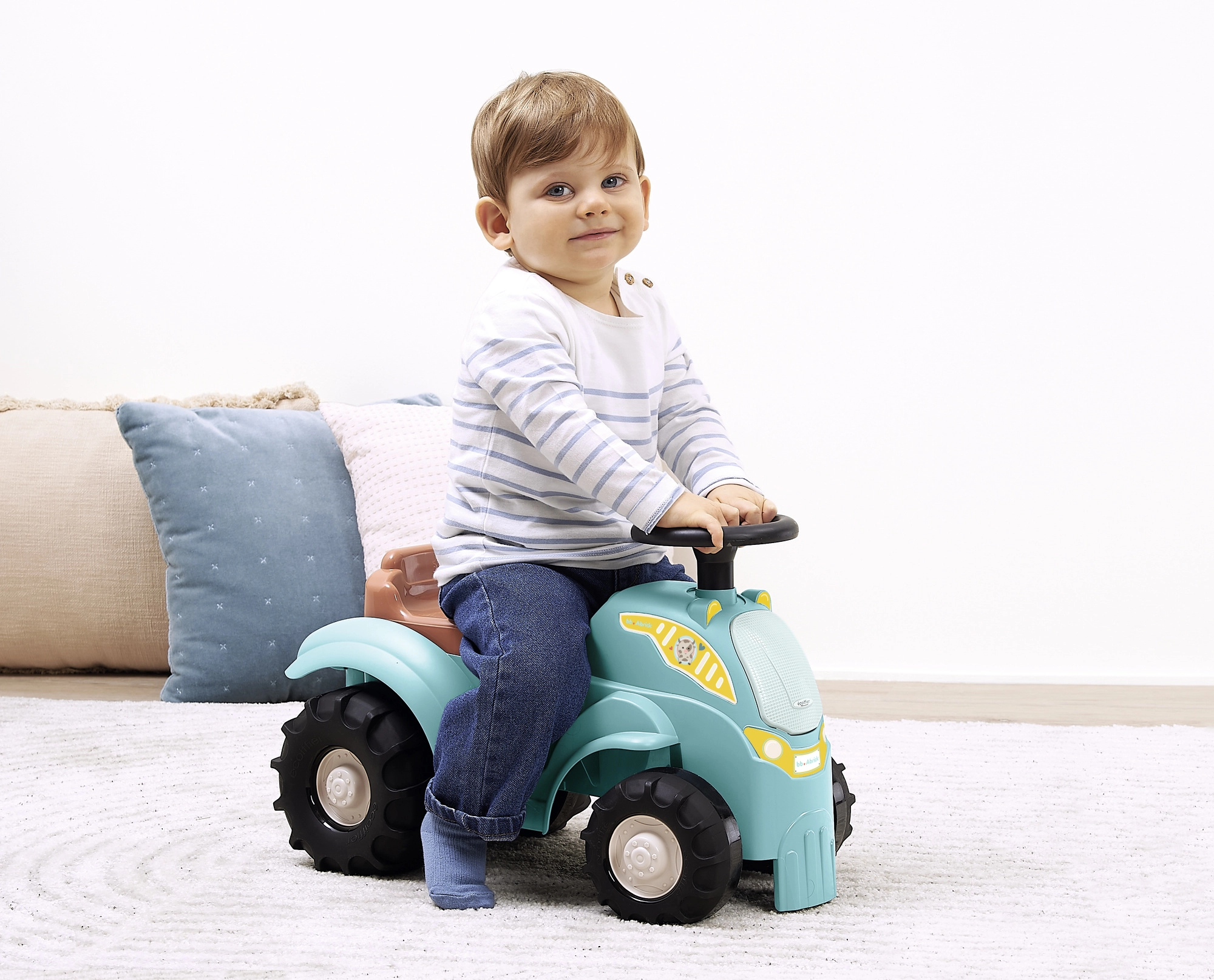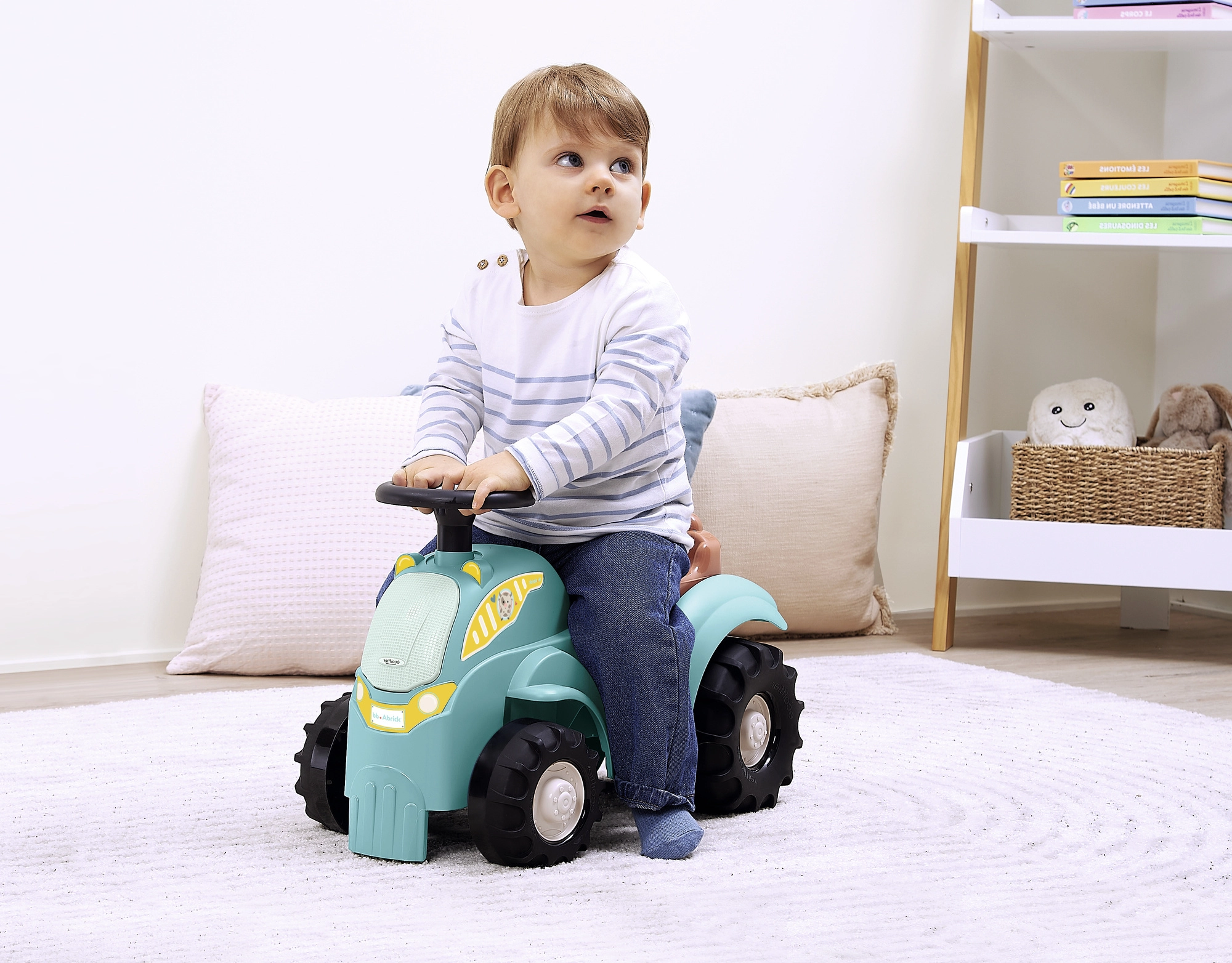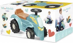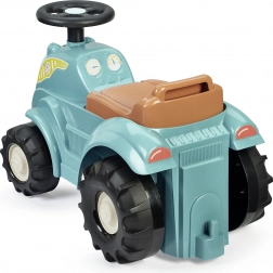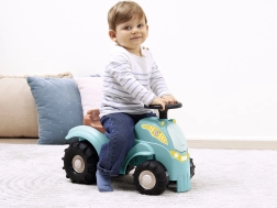 Acest vehicul de împins tip tractor, în culoare turcoaz/albastru, cu șezut maro și roți negre masive, este conceput pentru cei mai mici șoferi. Datorită caroseriei robuste din plastic și ecartamentului lat al roților, deplasarea este stabilă și sigură, în timp ce dimensiunile compacte facilitează utilizarea în interior, pe covor și pe pardoseală netedă.