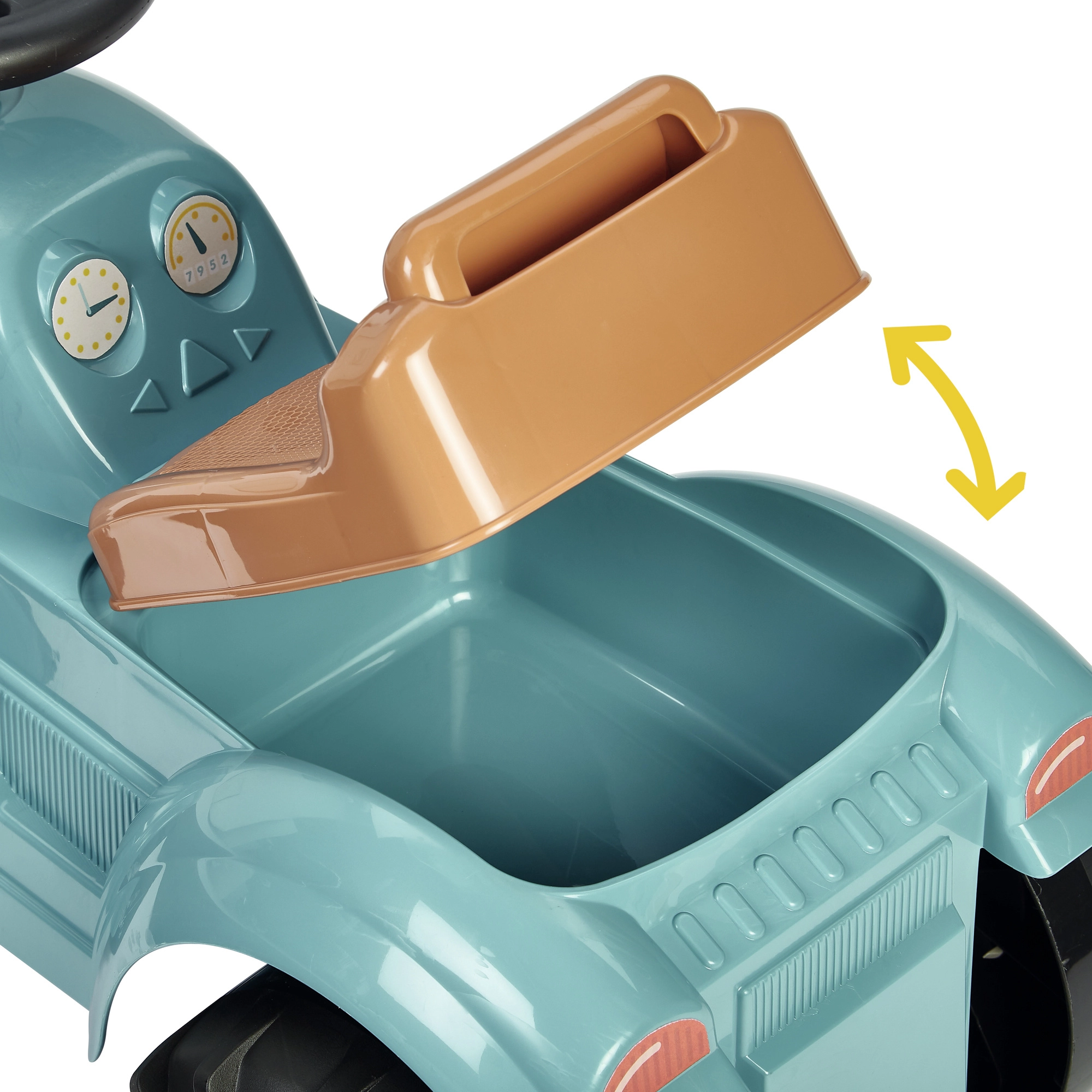 Șezutul rabatabil ascunde un compartiment practic pentru jucării sau mărunțișuri pe care copiii doresc să le aibă mereu cu ei.