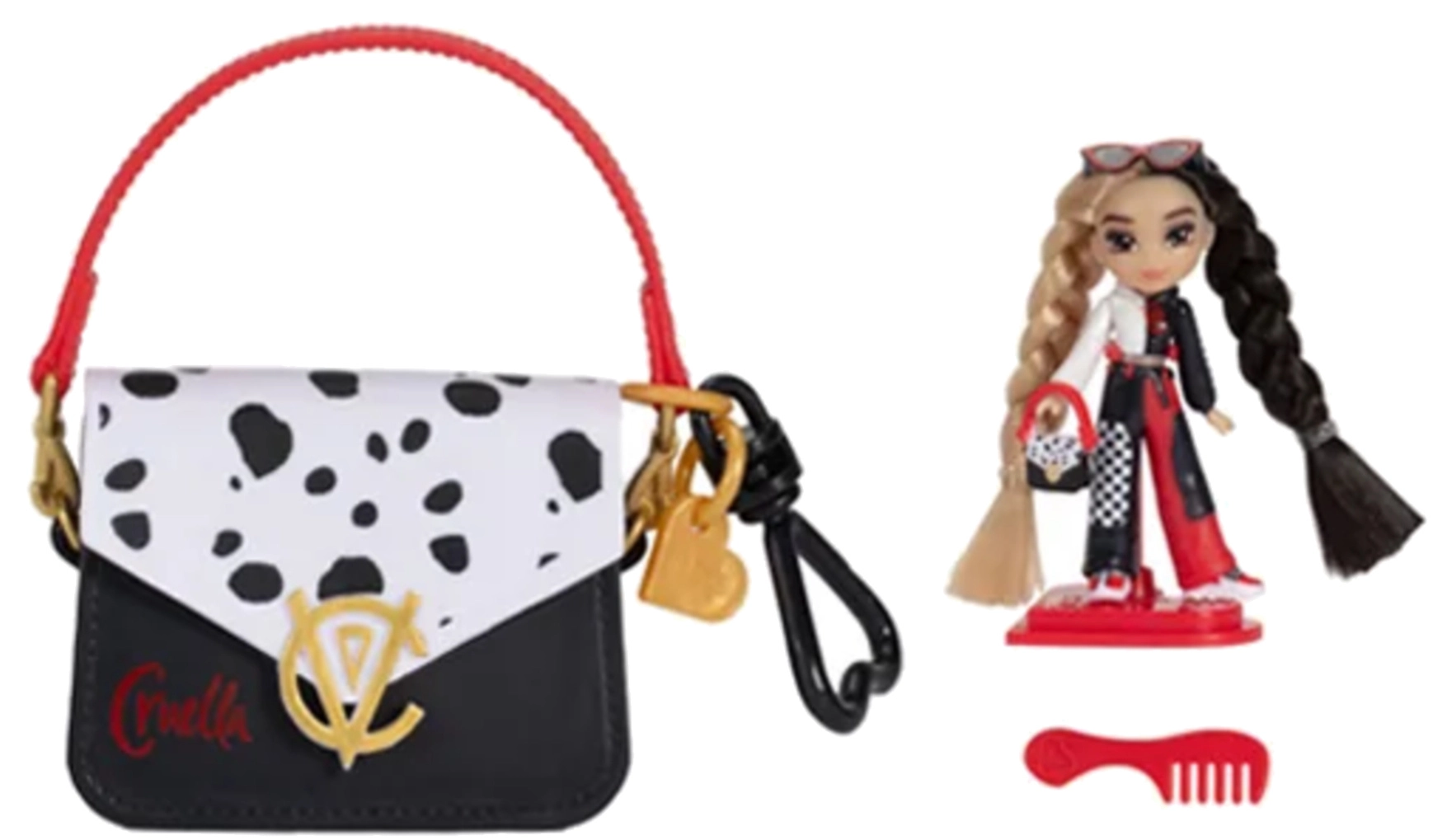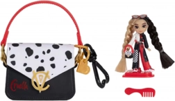 Întregul set poate fi luat ușor în călătorii datorită genții roz mai mari cu motiv Cruella, care încape păpușa și micile accesorii. Copiii se vor bucura să pieptene părul în două culori cu pieptănul, să o stilizeze cu ochelarii și să o expună pe suport.