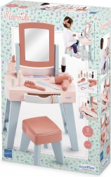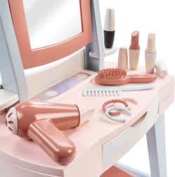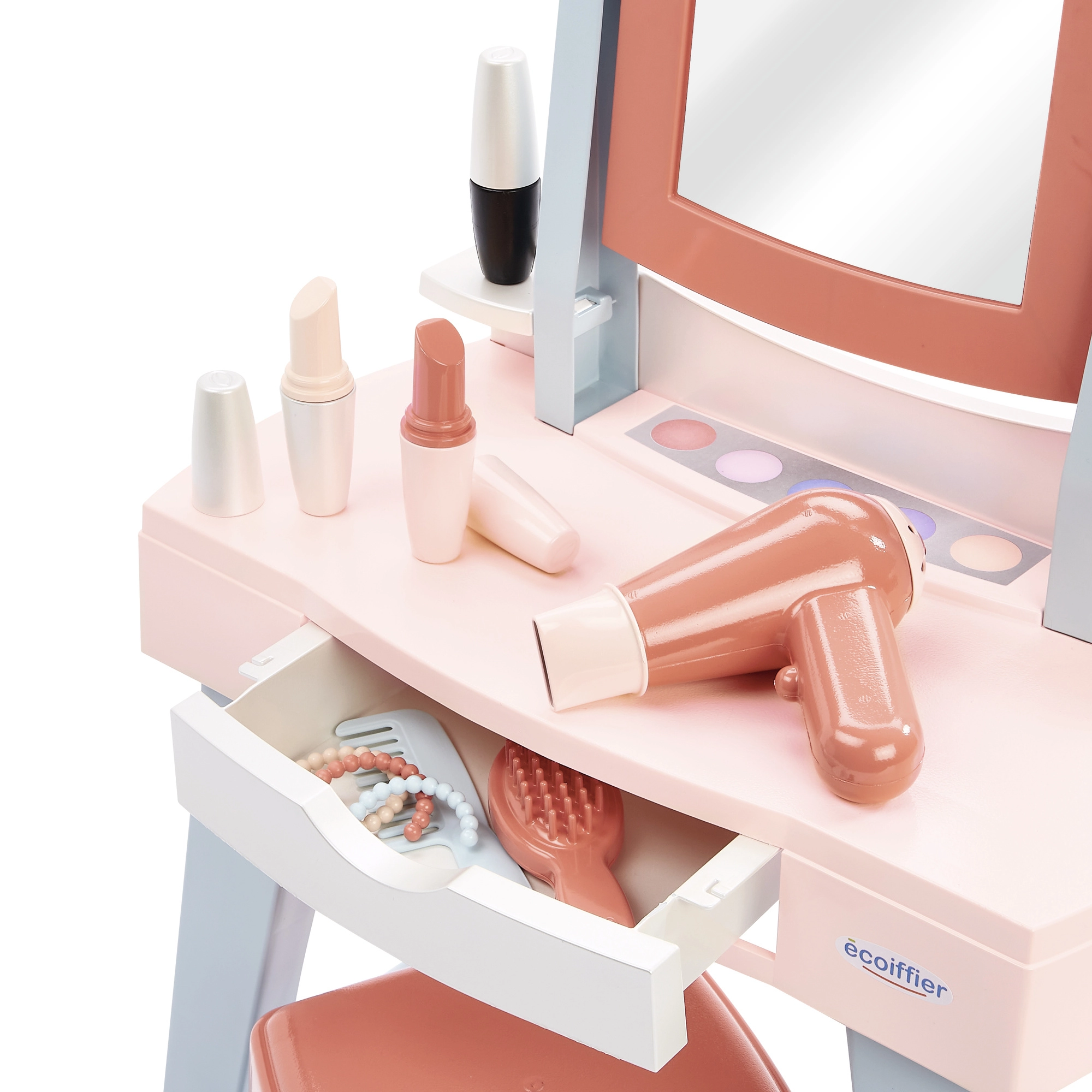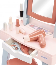 Masa de toaletă Mademoiselle aduce copiilor propriul lor colțișor de frumusețe cu oglindă, măsuță și scăunel confortabil. Setul bogat de accesorii – de la pieptene și perie, la uscător de păr pentru copii și „make-up” – susține jocul de rol și imaginația, în același timp învățând ordinea datorită sertarului integrat.